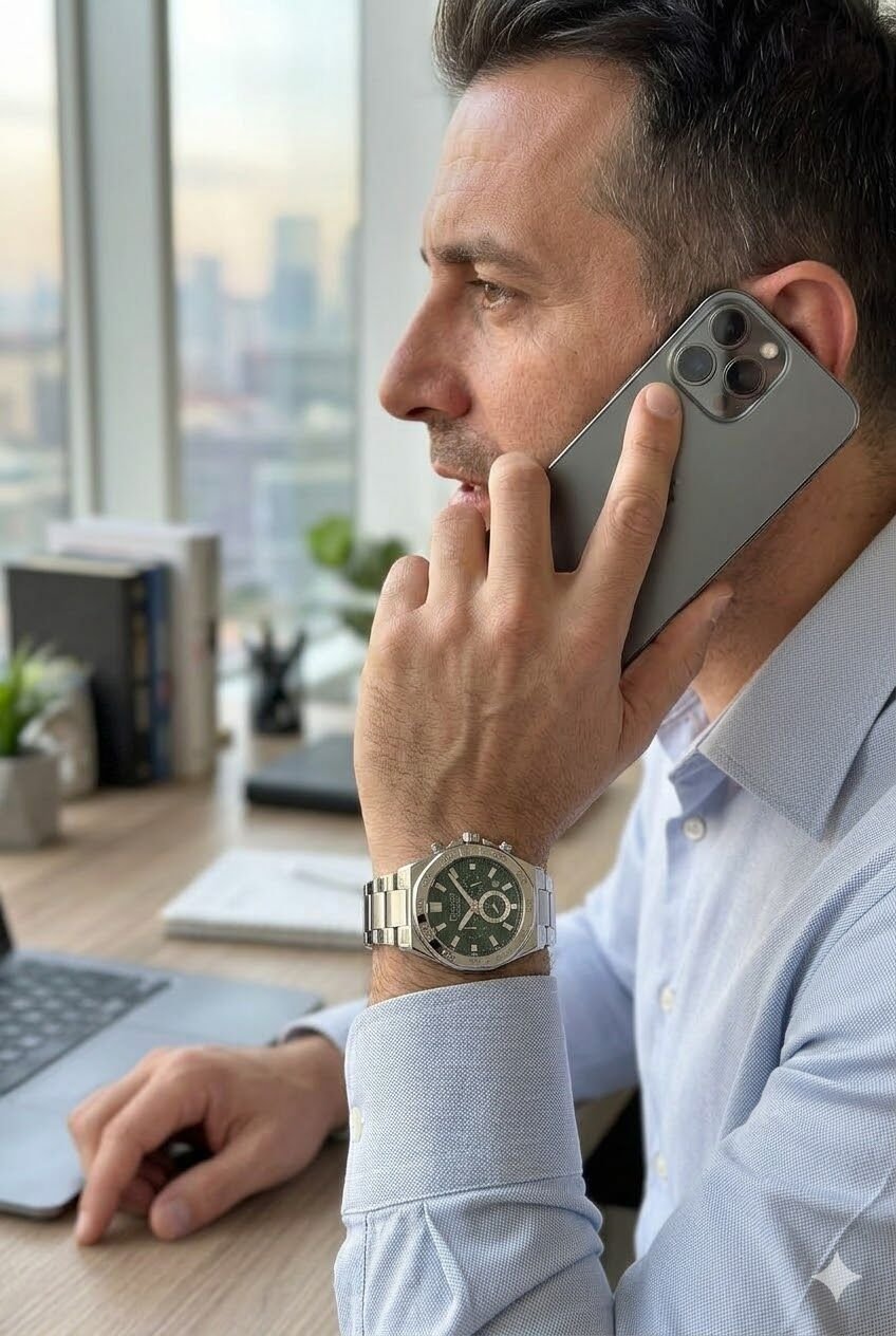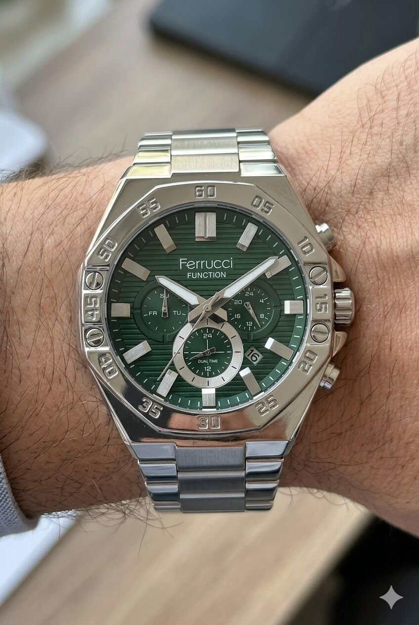 Ferrucci erkek kol saati yuvarlak kasa formu ve gümüş tonların güçlü uyumuyla dikkat çekici bir görünüm sunar. Çok fonksiyonlu kadran yapısı modele dinamik bir karakter kazandırırken yeşil kadran detayı saatin sportif ve modern stilini daha da öne çıkarır. Günlük kullanımda ve güçlü kombinlerde rahatlıkla tercih edilebilecek iddialı bir tasarıma sahiptir.