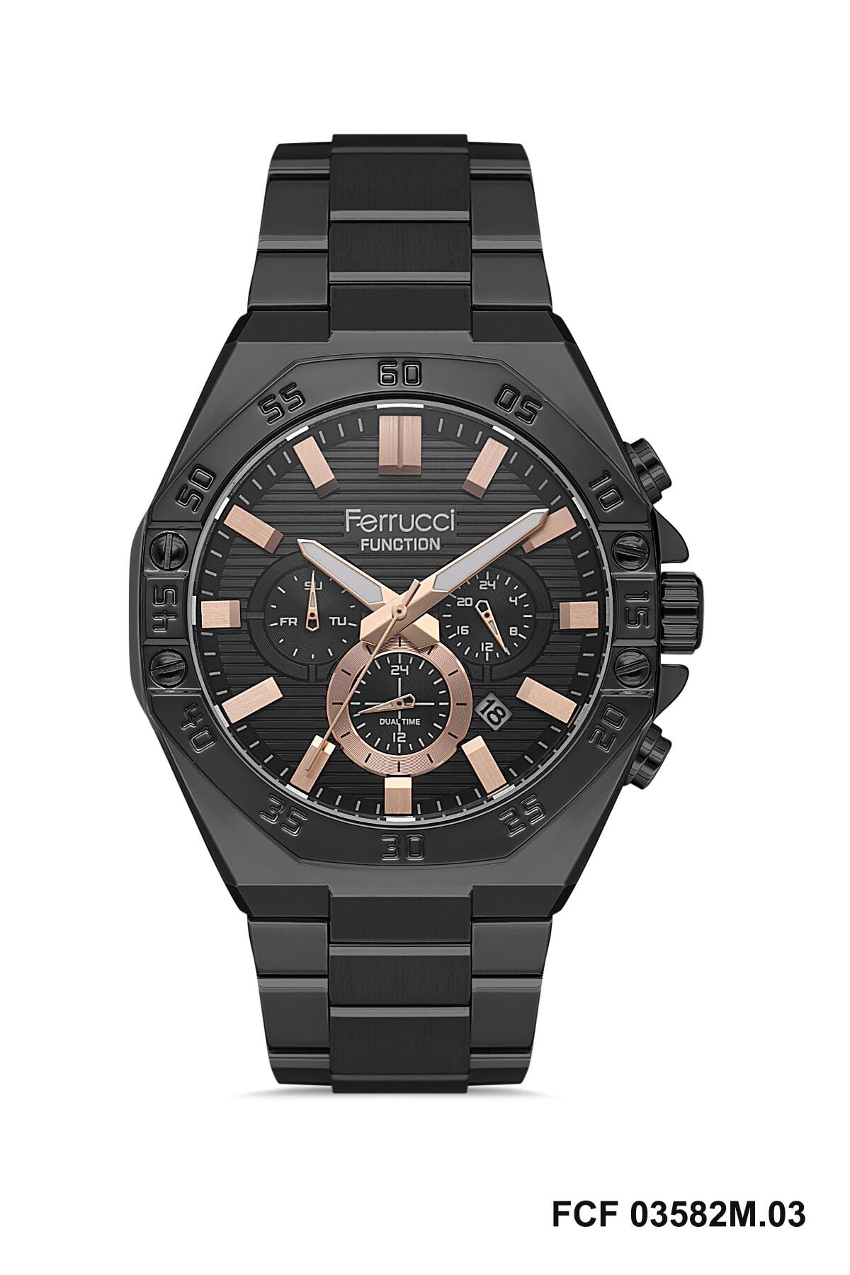 Siyah renkli metal kordon saatin genel tasarımını tamamlayan güçlü ve modern bir görünüm sunar. Bileğe uyum sağlayan yapısı sayesinde Ferrucci erkek kol saati gün boyu konforlu kullanım sağlar.