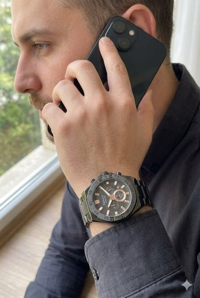 Ferrucci erkek kol saati yuvarlak kasa formu ve siyah tonların güçlü uyumuyla dikkat çekici bir görünüm sunar. Çok fonksiyonlu kadran yapısı modele dinamik bir karakter kazandırırken rose tonlu detaylar saatin sportif ve modern stilini daha da öne çıkarır. Günlük kullanımda ve güçlü kombinlerde rahatlıkla tercih edilebilecek iddialı bir tasarıma sahiptir.