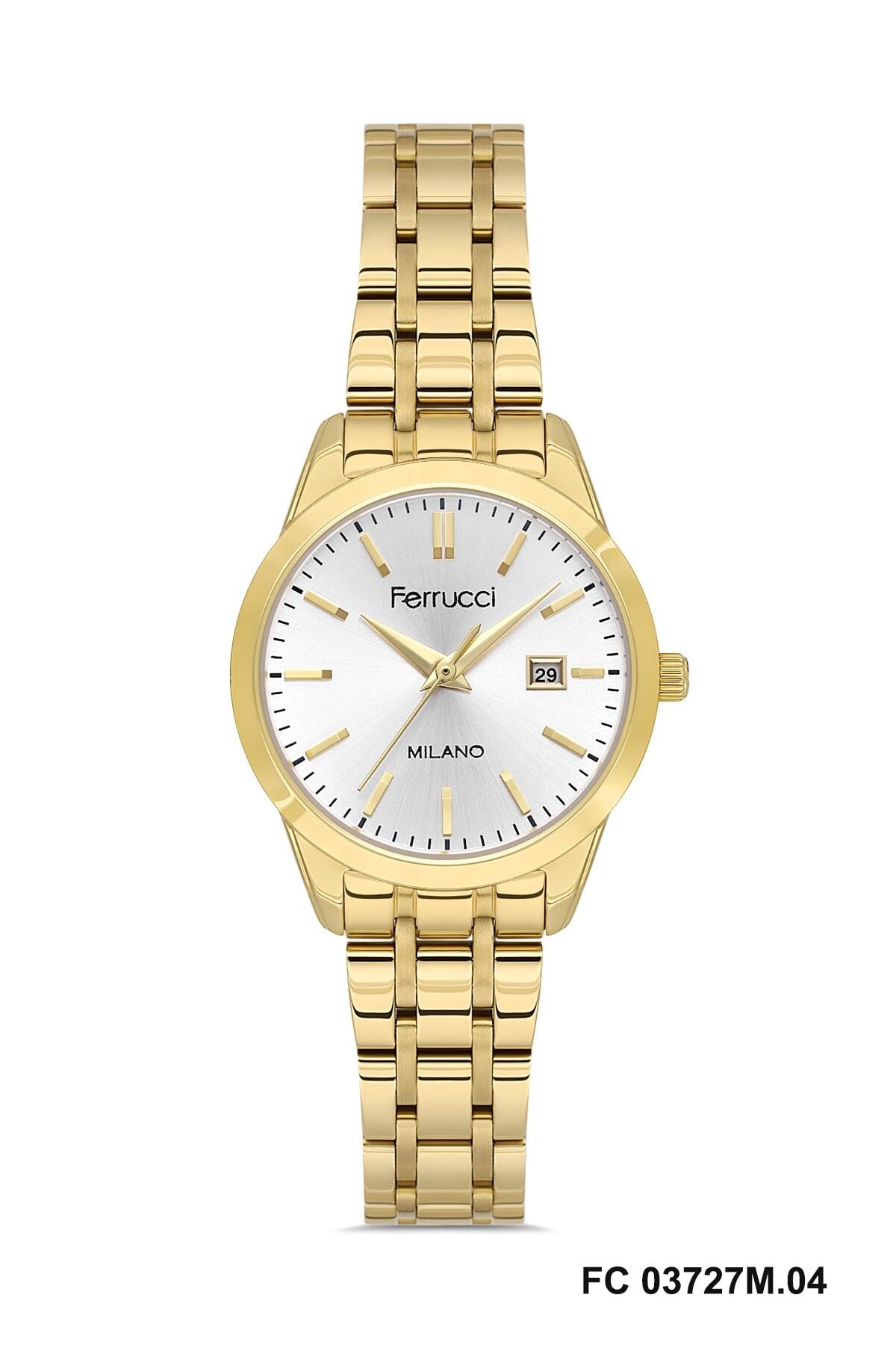 Altın renkli metal kordon saatin genel tasarımını tamamlayan modern ve zarif bir görünüm sunar. Bileğe uyum sağlayan yapısı sayesinde Ferrucci kadın kol saati gün boyu konforlu kullanım sağlar.