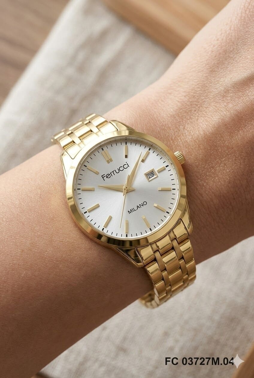 Ferrucci kadın kol saati yuvarlak kasa formu ve altın tonların modern uyumuyla zarif bir görünüm sunar. Gümüş kadran detayı modele sade ama etkileyici bir karakter kazandırırken takvim penceresi günlük kullanımda pratiklik sağlar. Günlük kombinlerde ve klasik stillerde rahatlıkla tercih edilebilecek şık bir tasarıma sahiptir.
