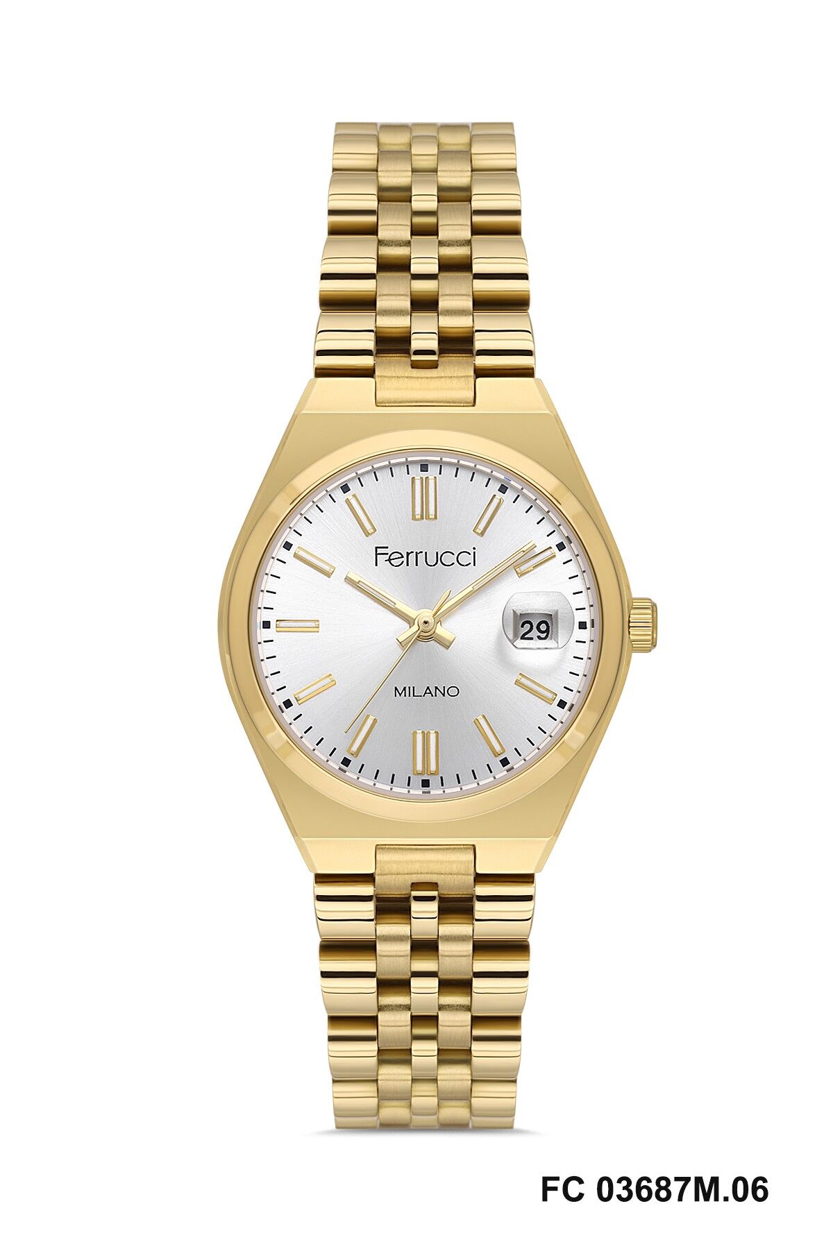 Altın renkli metal kordon saatin genel tasarımını tamamlayan modern ve zarif bir görünüm sunar. Bileğe uyum sağlayan yapısı sayesinde Ferrucci kadın kol saati gün boyu konforlu kullanım sağlar.