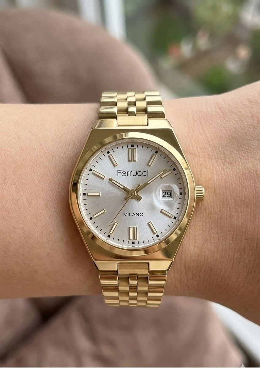 Ferrucci kadın kol saati yuvarlak kasa formu ve altın tonların modern uyumuyla zarif bir görünüm sunar. Gümüş kadran detayı modele sade ama etkileyici bir karakter kazandırırken takvim penceresi günlük kullanımda pratiklik sağlar. Günlük kombinlerde ve klasik stillerde rahatlıkla tercih edilebilecek şık bir tasarıma sahiptir.