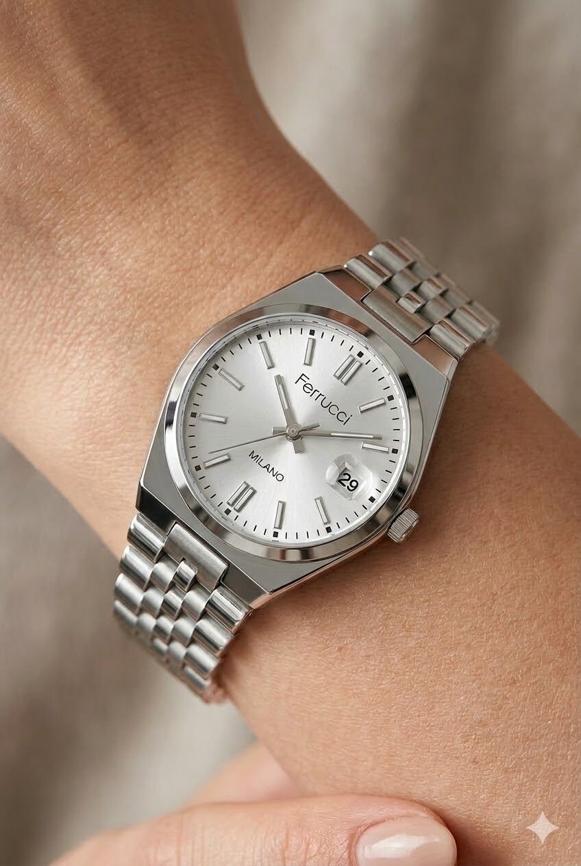 Ferrucci kadın kol saati yuvarlak kasa formu ve gümüş tonların modern uyumuyla zarif bir görünüm sunar. Gümüş kadran detayı modele sade ama etkileyici bir karakter kazandırırken takvim penceresi günlük kullanımda pratiklik sağlar. Günlük kombinlerde ve klasik stillerde rahatlıkla tercih edilebilecek şık bir tasarıma sahiptir.