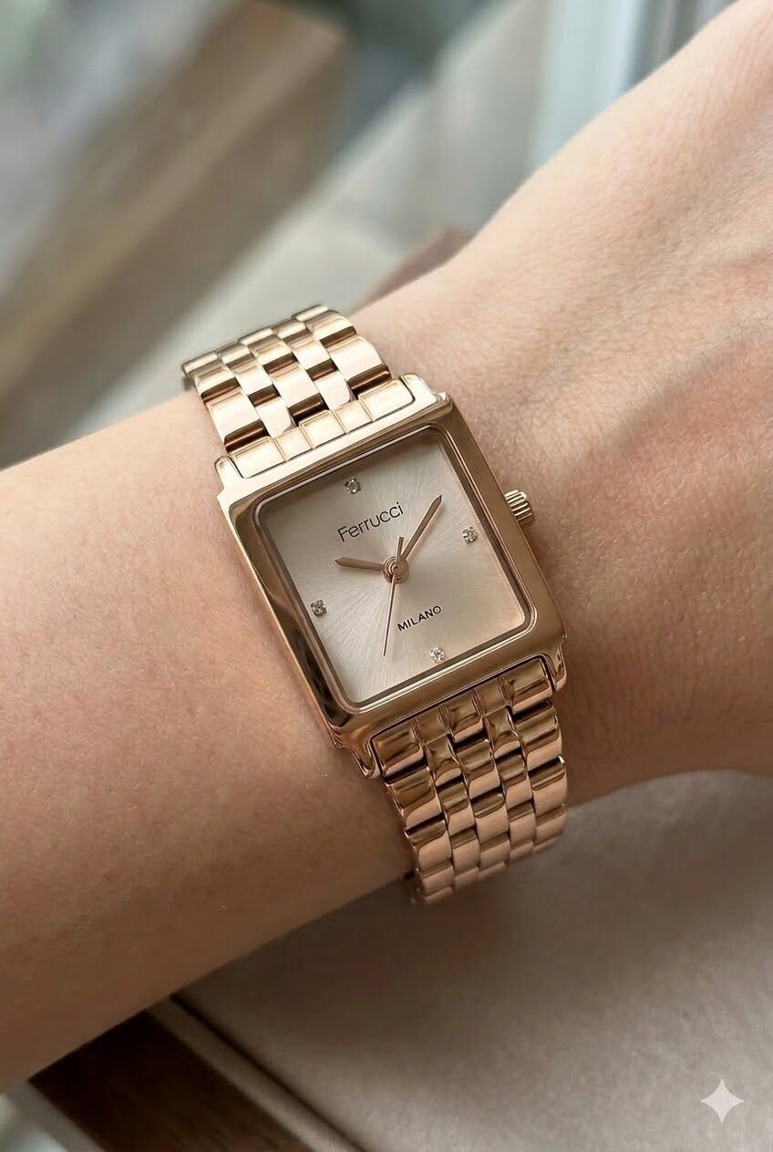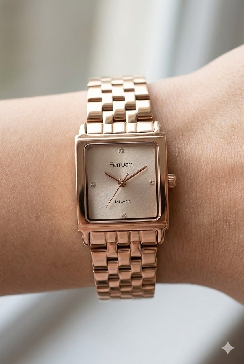 Ferrucci kadın kol saati kare kasa formu ve rose tonların uyumuyla zarif ve modern bir görünüm sunar. Minimal kadran yapısı ve taş detayları modele feminen bir karakter kazandırırken bilekte sade ama etkileyici bir duruş sağlar. Günlük kullanımda ve özel gün kombinlerinde rahatlıkla tercih edilebilecek şık bir tasarıma sahiptir.