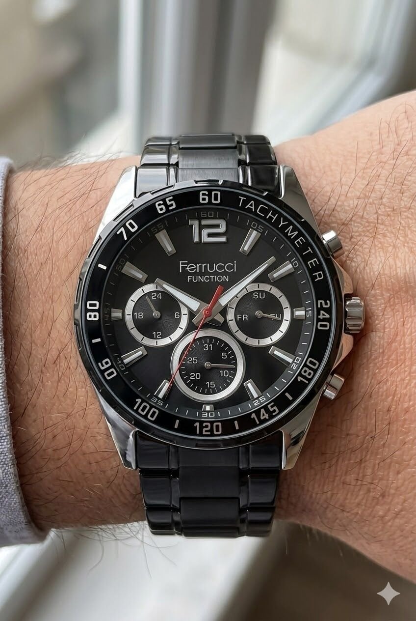 Ferrucci erkek kol saati yuvarlak kasa formu, güçlü bezel yapısı ve siyah kadran tasarımıyla dikkat çekici bir görünüm sunar. Kadran üzerindeki çok fonksiyonlu detaylar modele sportif ve karakterli bir stil kazandırırken siyah kasa ve kordon uyumu saatin modern duruşunu tamamlar. Günlük kullanımda ve şehir stilinde rahatlıkla tercih edilebilecek şık bir tasarıma sahiptir.