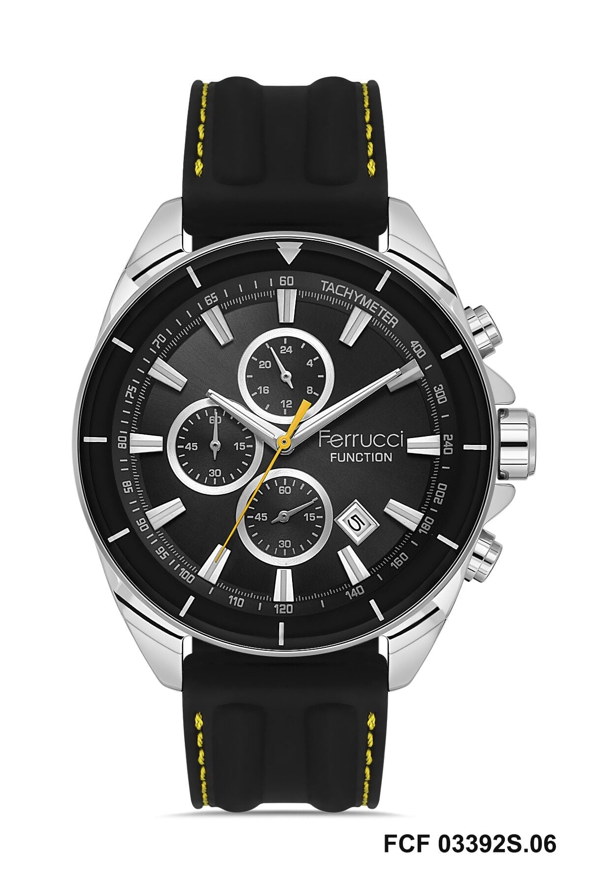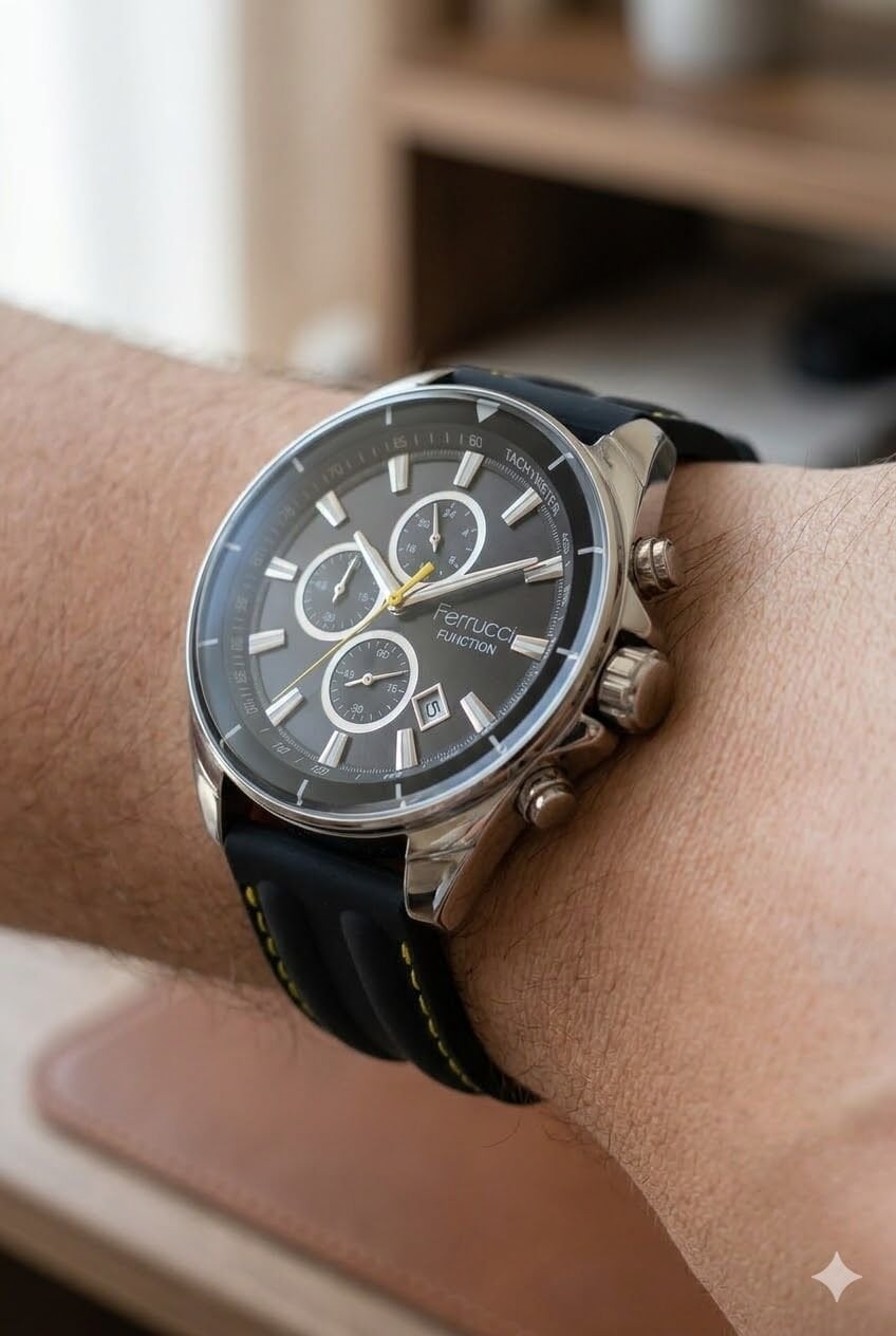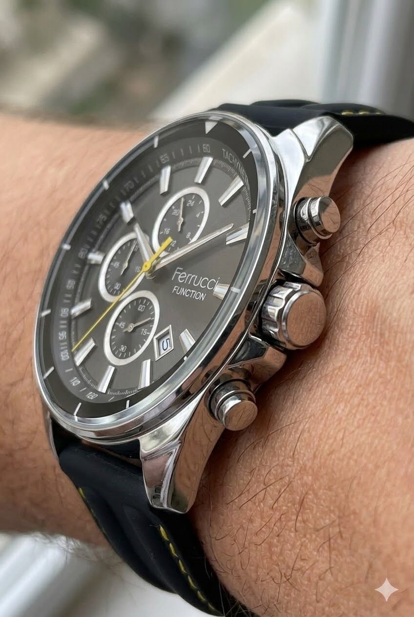 Ferrucci erkek kol saati siyah ve gümüş tonların güçlü uyumuyla dikkat çekici bir görünüm sunar. Çok fonksiyonlu kadran yapısı modele dinamik bir karakter kazandırırken sarı detaylar sportif görünümü daha enerjik hale getirir. Günlük kullanımda ve sportif kombinlerde rahatlıkla tercih edilebilecek modern bir tasarıma sahiptir.