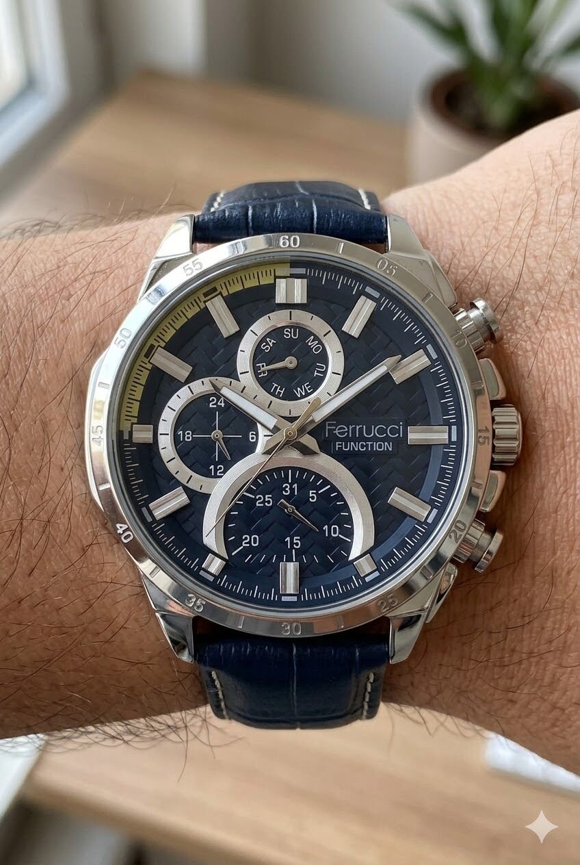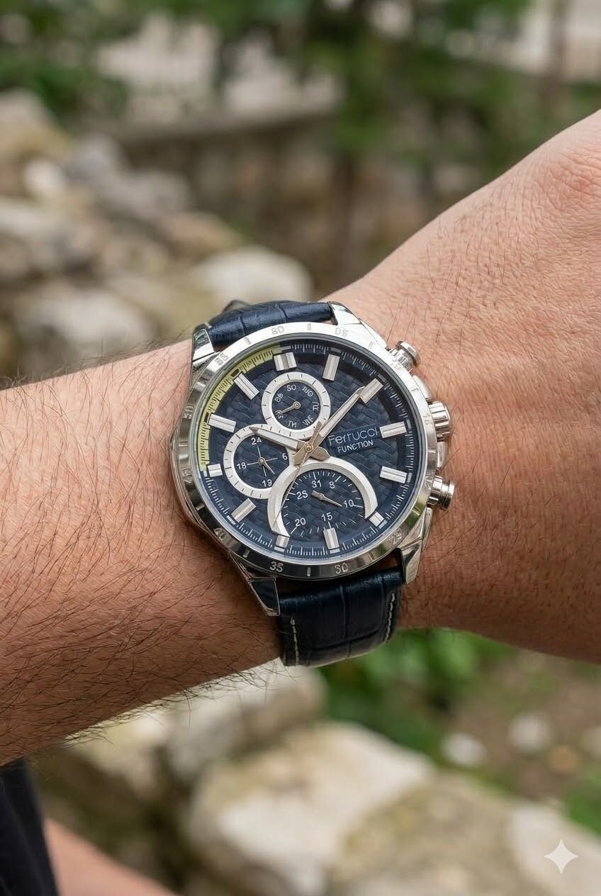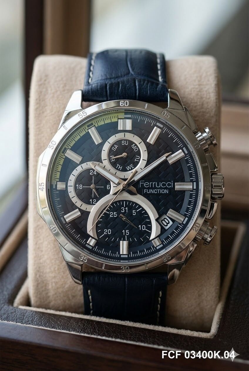 Ferrucci erkek kol saati yuvarlak kasa formu ve gümüş tonların güçlü uyumuyla dikkat çekici bir görünüm sunar. Çok fonksiyonlu kadran yapısı modele dinamik bir karakter kazandırırken koyu mavi kadran ve lacivert deri kayış kombinasyonu saatin sportif ve modern stilini öne çıkarır. Günlük kullanımda ve özel kombinlerde rahatlıkla tercih edilebilecek iddialı bir tasarıma sahiptir.