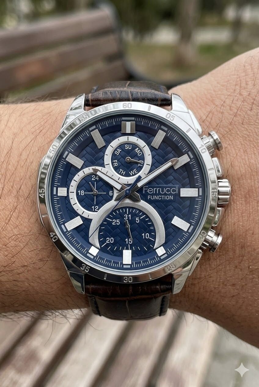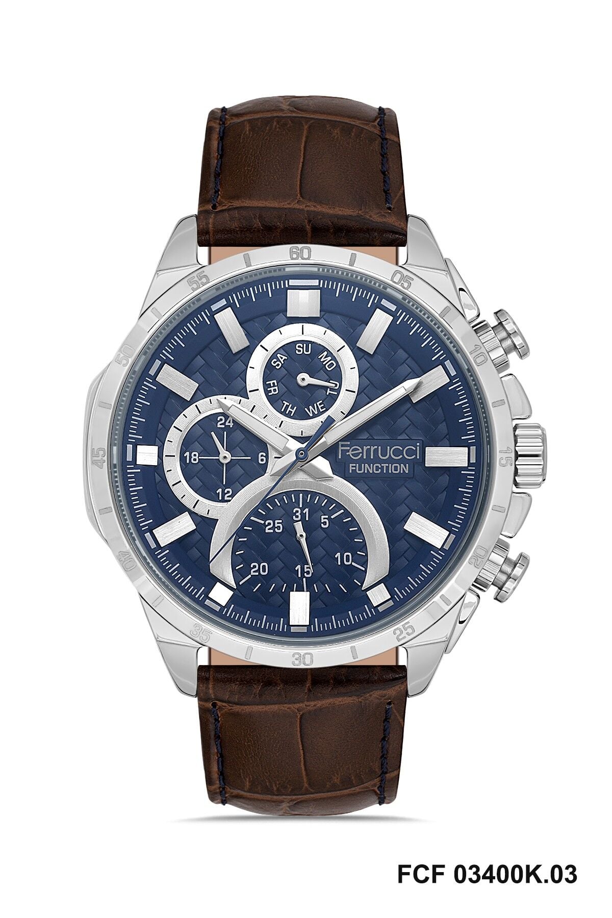 Ferrucci erkek kol saati yuvarlak kasa formu ve gümüş tonların güçlü uyumuyla dikkat çekici bir görünüm sunar. Çok fonksiyonlu kadran yapısı modele dinamik bir karakter kazandırırken koyu mavi kadran ve kahverengi deri kayış kombinasyonu saatin klasik ve sportif stilini bir araya getirir. Günlük kullanımda ve özel kombinlerde rahatlıkla tercih edilebilecek iddialı bir tasarıma sahiptir.