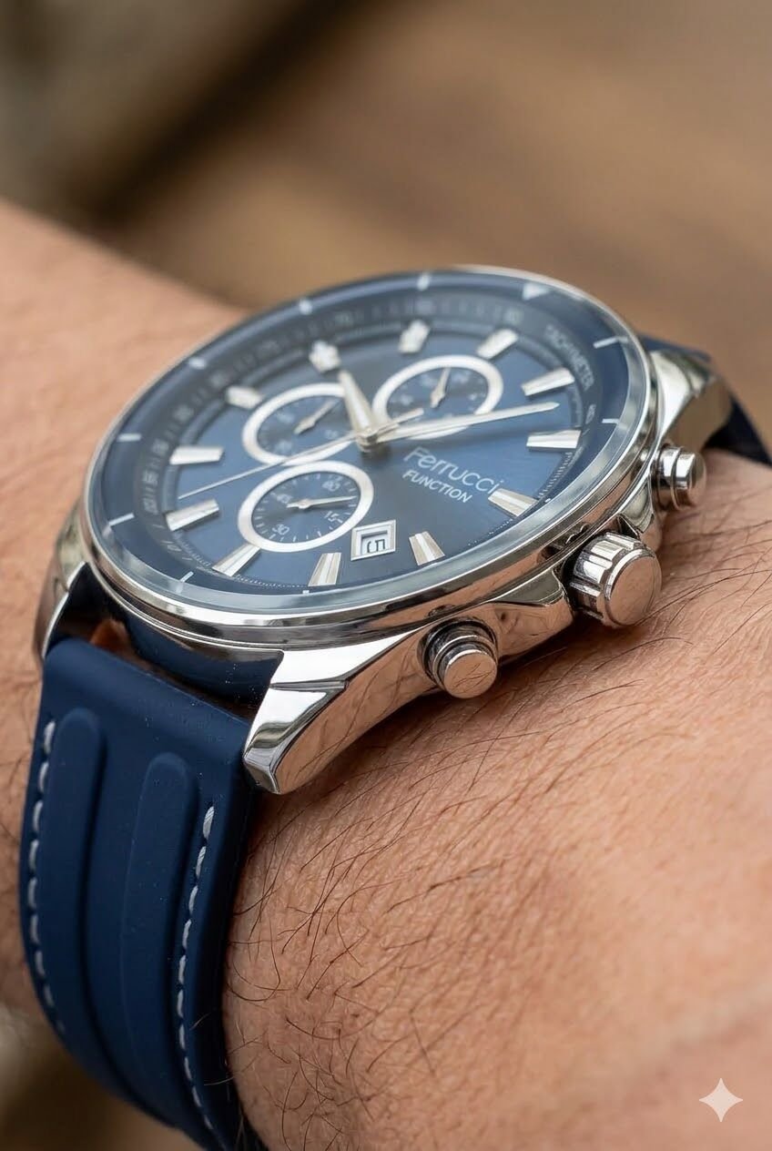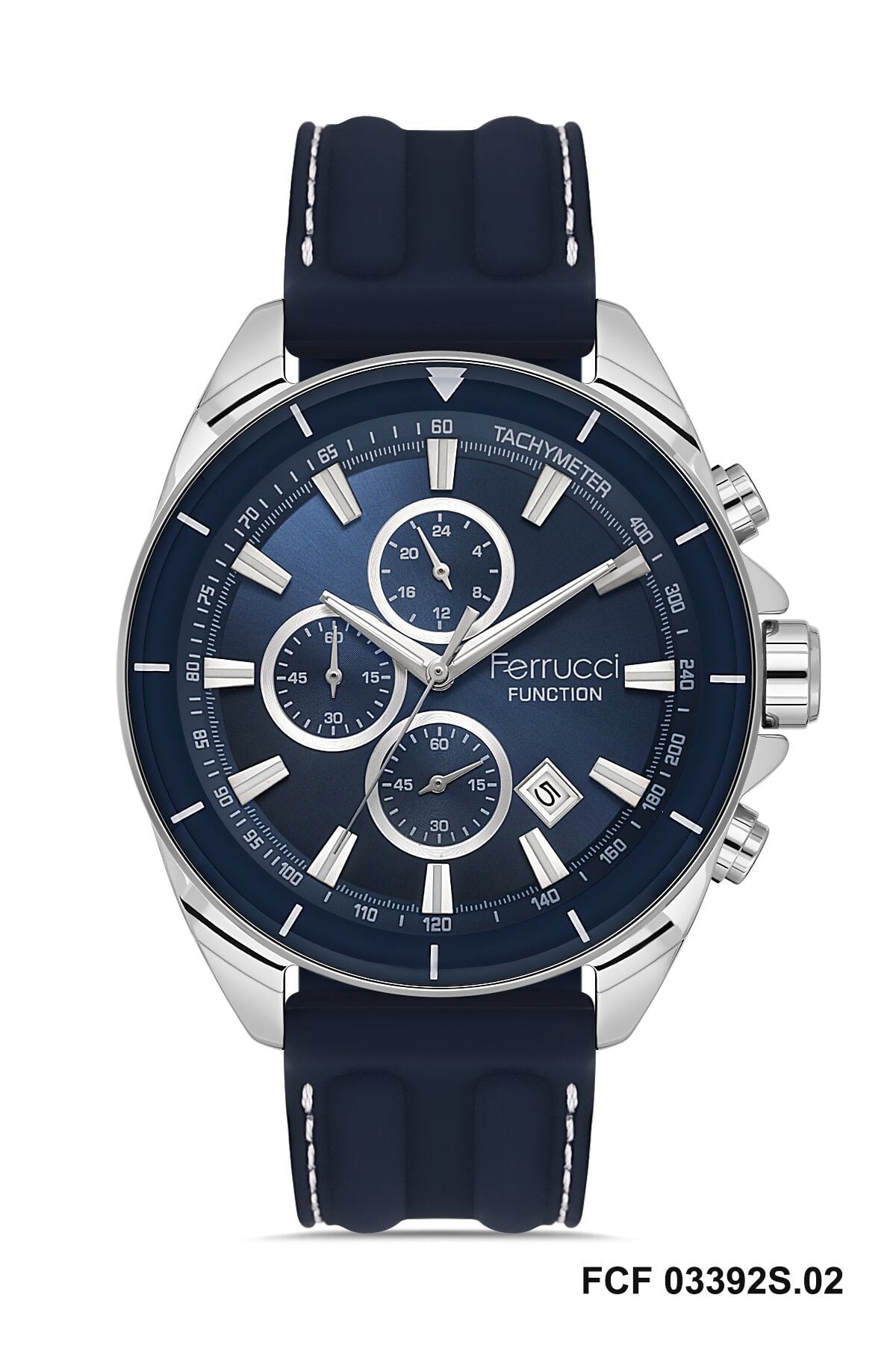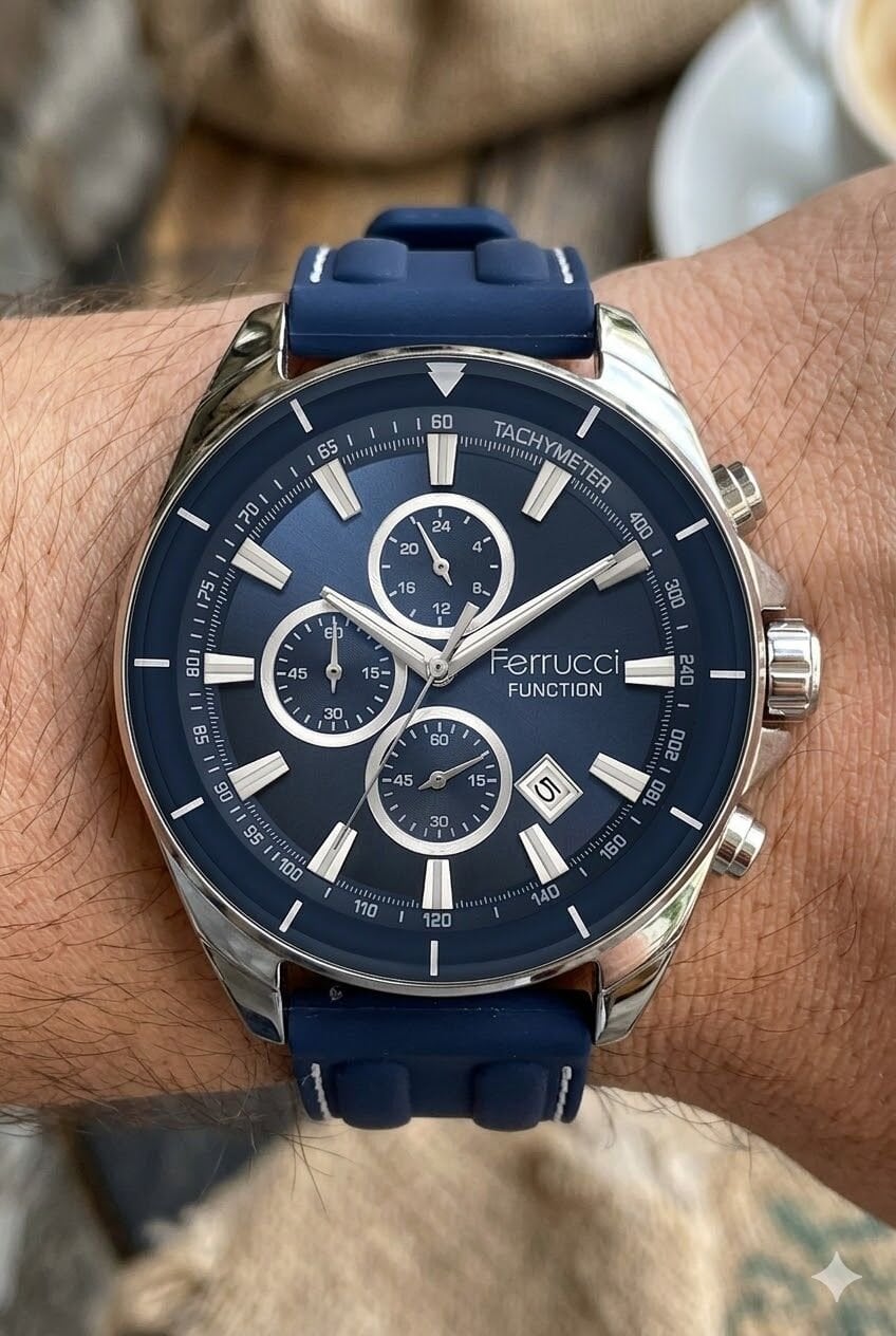 Ferrucci erkek kol saati mavi tonların güçlü uyumu ve çok fonksiyonlu kadran yapısı ile dikkat çeker. Sportif çizgilerle şekillenen tasarım, günlük kullanımda enerjik ve modern bir görünüm sunar. Gümüş kasa ile lacivert silikon kordonun uyumu saatin karakterini daha da belirgin hale getirir.