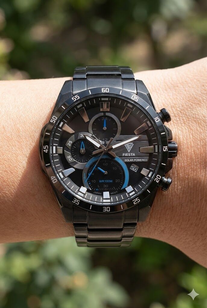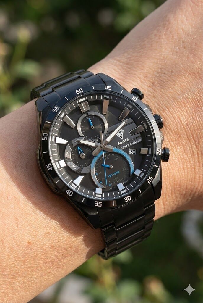 Fiesta erkek kol saati; solar powered (ışık enerjisiyle çalışan) mekanizması, güçlü tasarımı ve fonksiyonel yapısıyla modern erkek stiline hitap eder. Siyah çelik kasa ve kordonu, sportif detaylarla birleşerek dinamik ve maskülen bir görünüm sunar.