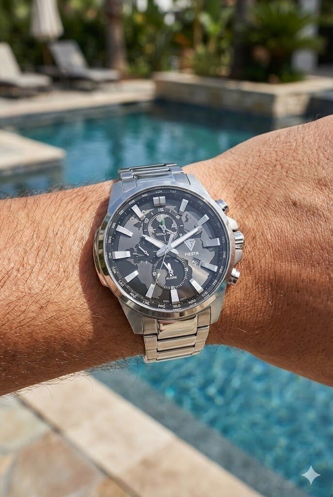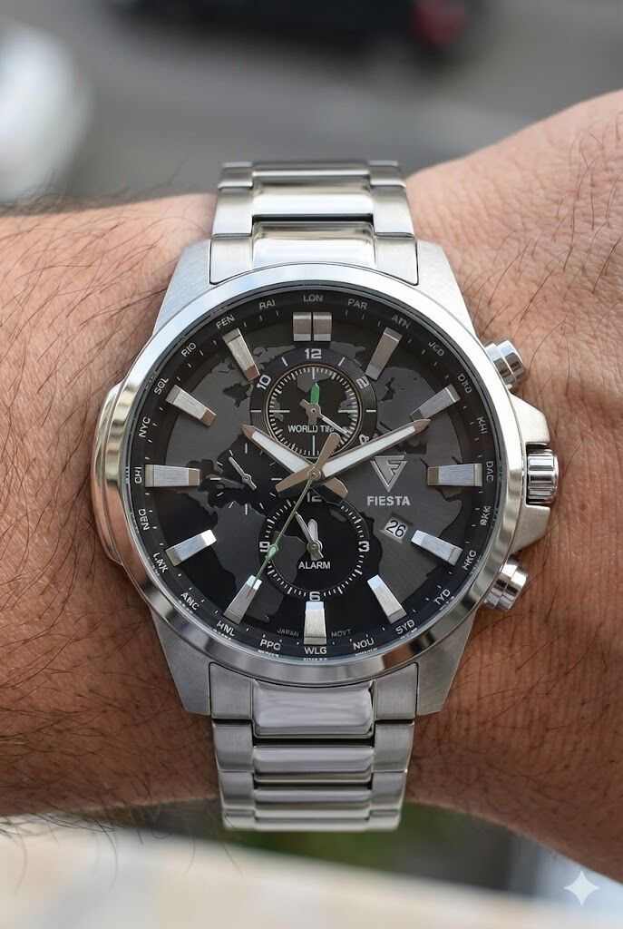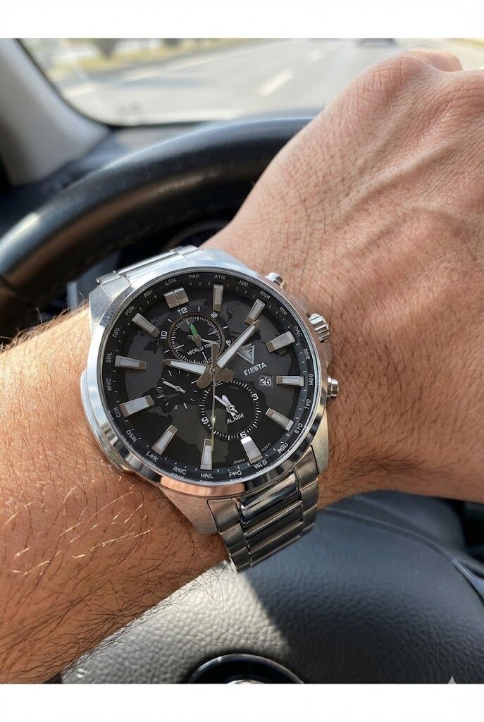 Fiesta erkek kol saati; 45 mm geniş çelik kasası, world time (dünya saatleri) detaylı kadranı ve güçlü tasarımıyla dikkat çeker. Gümüş renk çelik kordonu ve safir camı sayesinde hem sportif hem de modern bir kullanım sunar.