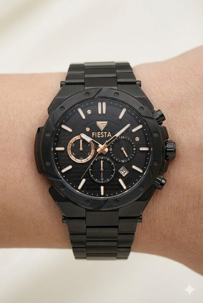 Fiesta erkek kol saati, güçlü kasa ölçüsü ve sportif tasarımıyla dikkat çeken iddialı bir modeldir. Siyah tonlu çelik kasa ve kordon yapısı, modern çizgilerle birleşerek dinamik bir görünüm sunar. Günlük kullanımda ve spor kombinlerde şıklığı tamamlayan bir tercih olarak öne çıkar.