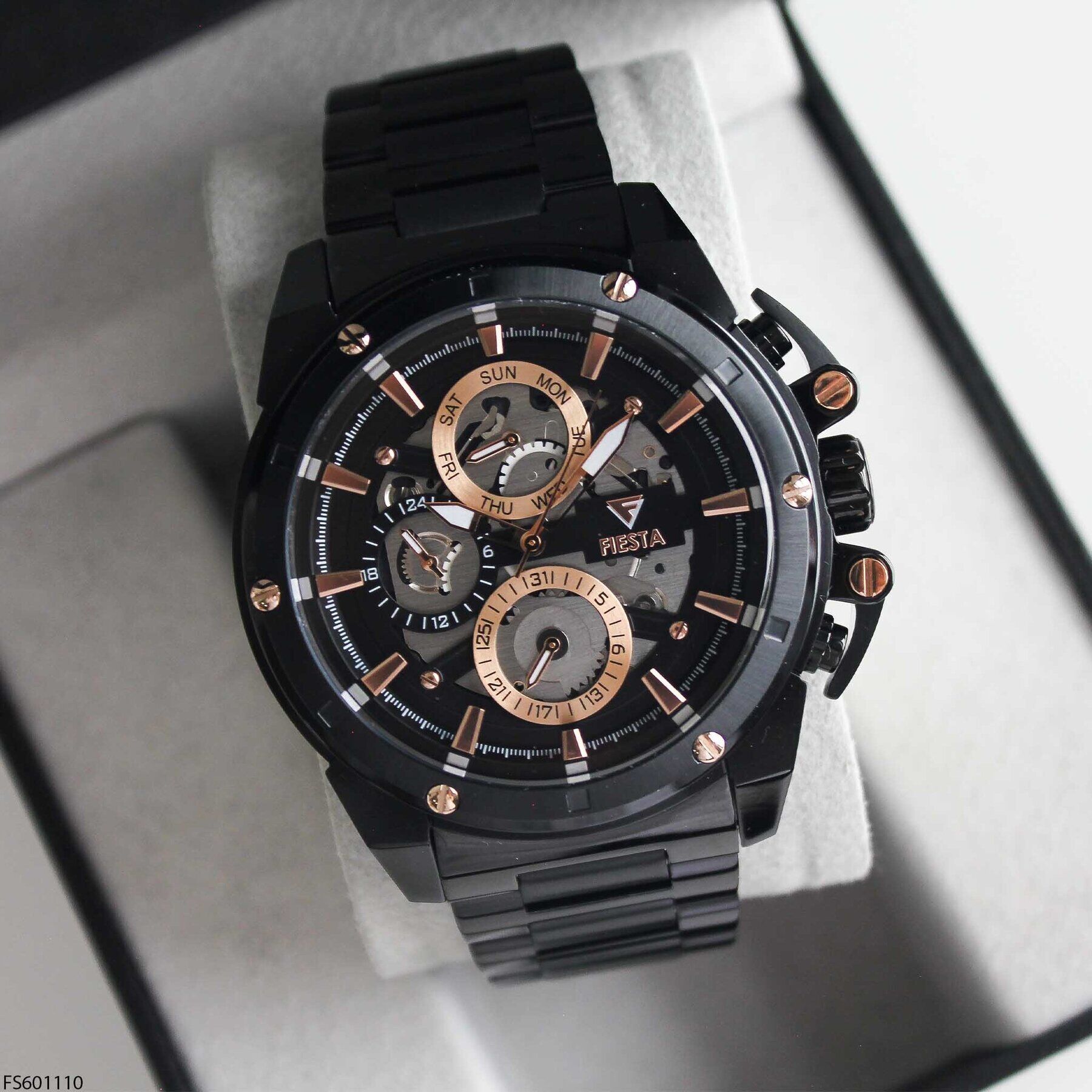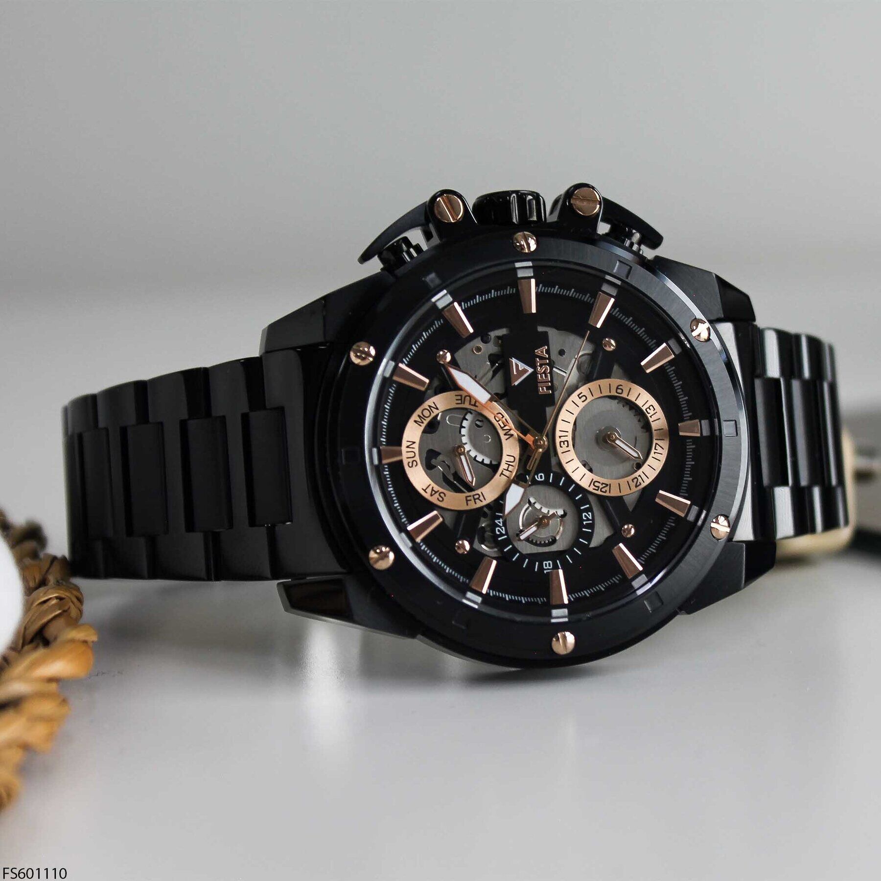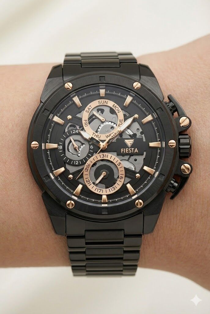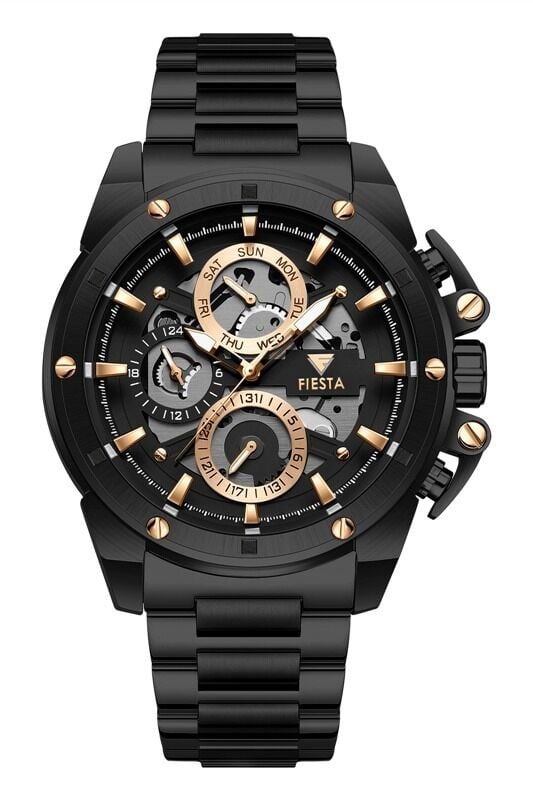 Fiesta erkek kol saati, büyük kasa ölçüsü ve güçlü tasarımıyla maskülen bir duruş sergileyen iddialı bir modeldir. Siyah tonlu çelik kasa ve kordon yapısı, çoklu alt kadran tasarımıyla birleşerek sportif ve modern bir görünüm sunar. Günlük kullanımda ve spor kombinlerde dikkat çekici bir tercih oluşturur.