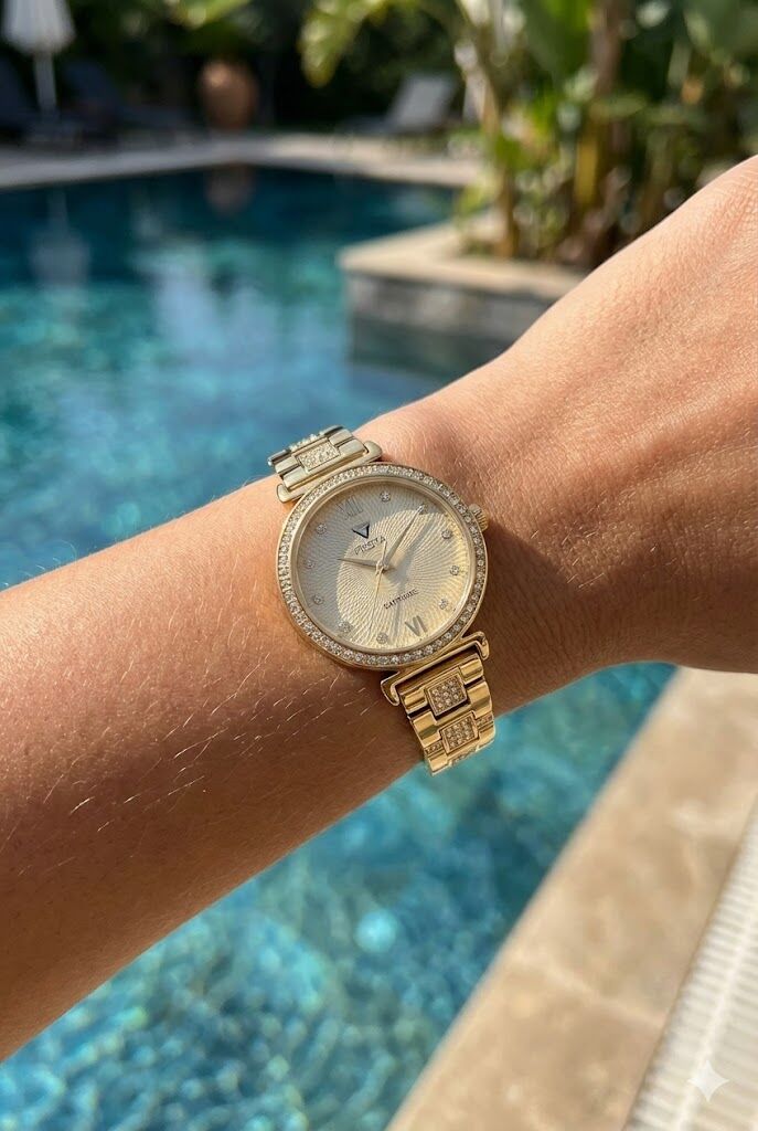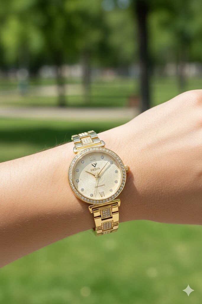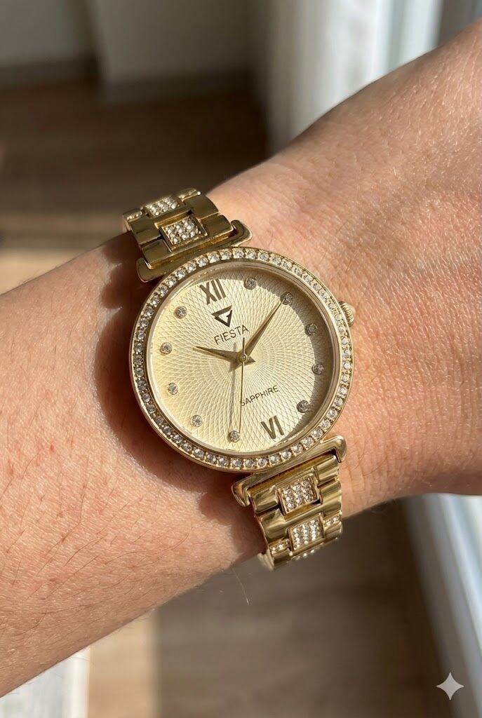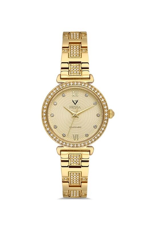 Fiesta kadın kol saati, altın tonlu zarif tasarımı ve taş detaylarıyla şıklığı ön plana çıkaran özel bir modeldir. Yuvarlak kasa formu ve ince bilezik yapısı sayesinde bilekte feminen ve dikkat çekici bir duruş sunar. Günlük kullanımın yanı sıra özel davetlerde de kombinlerinizi tamamlar.