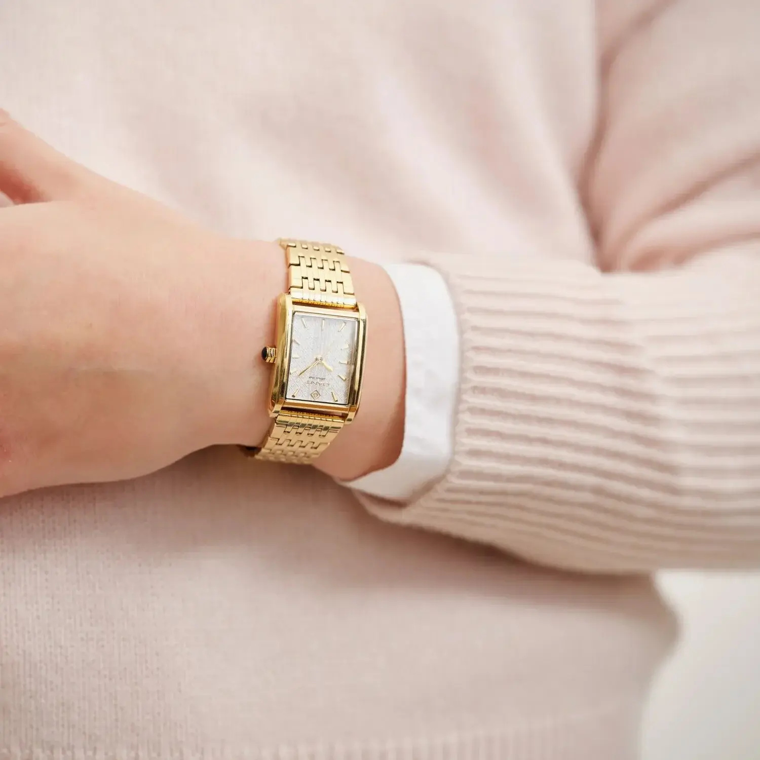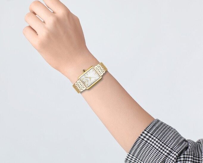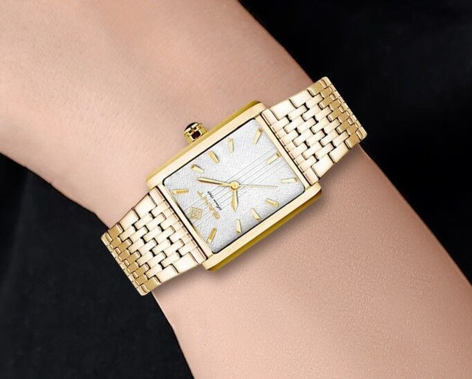 Dikdörtgen altın renk kasa yapısı modelin zarafetini ön plana çıkarırken, sade indeks düzeni ve ince kadran dokusu ile modern bir görünüm sunar. Minimal ve feminen tasarımıyla stilinizi tamamlar.