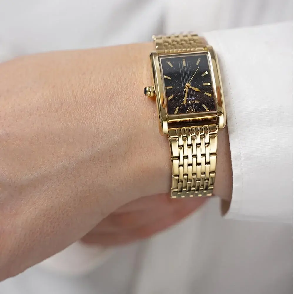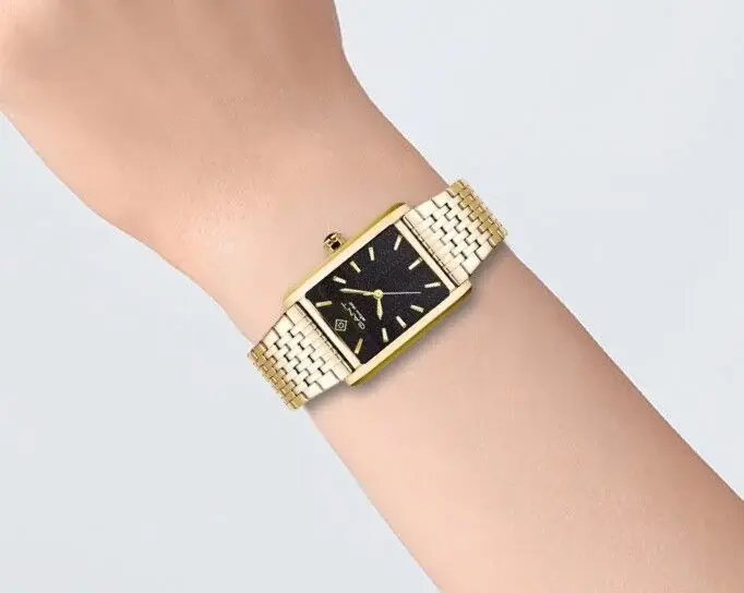 Altın renkli dikdörtgen kasa yapısı modele sofistike bir görünüm kazandırırken, siyah kadran ile oluşan kontrast saate güçlü ve şık bir karakter kazandırır. İnce detayları ile klasik şıklığı zamansız bir tasarımla buluşturur.