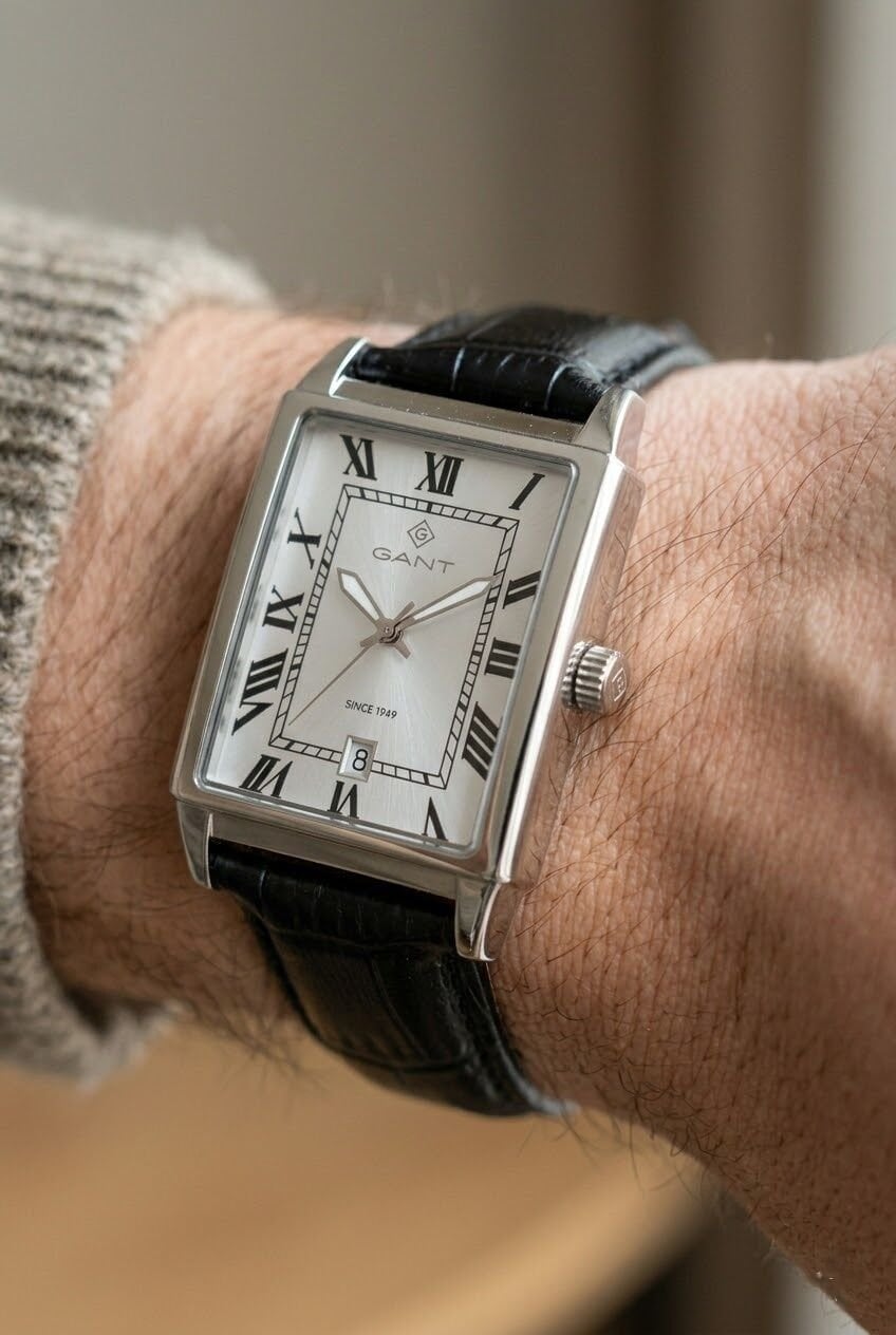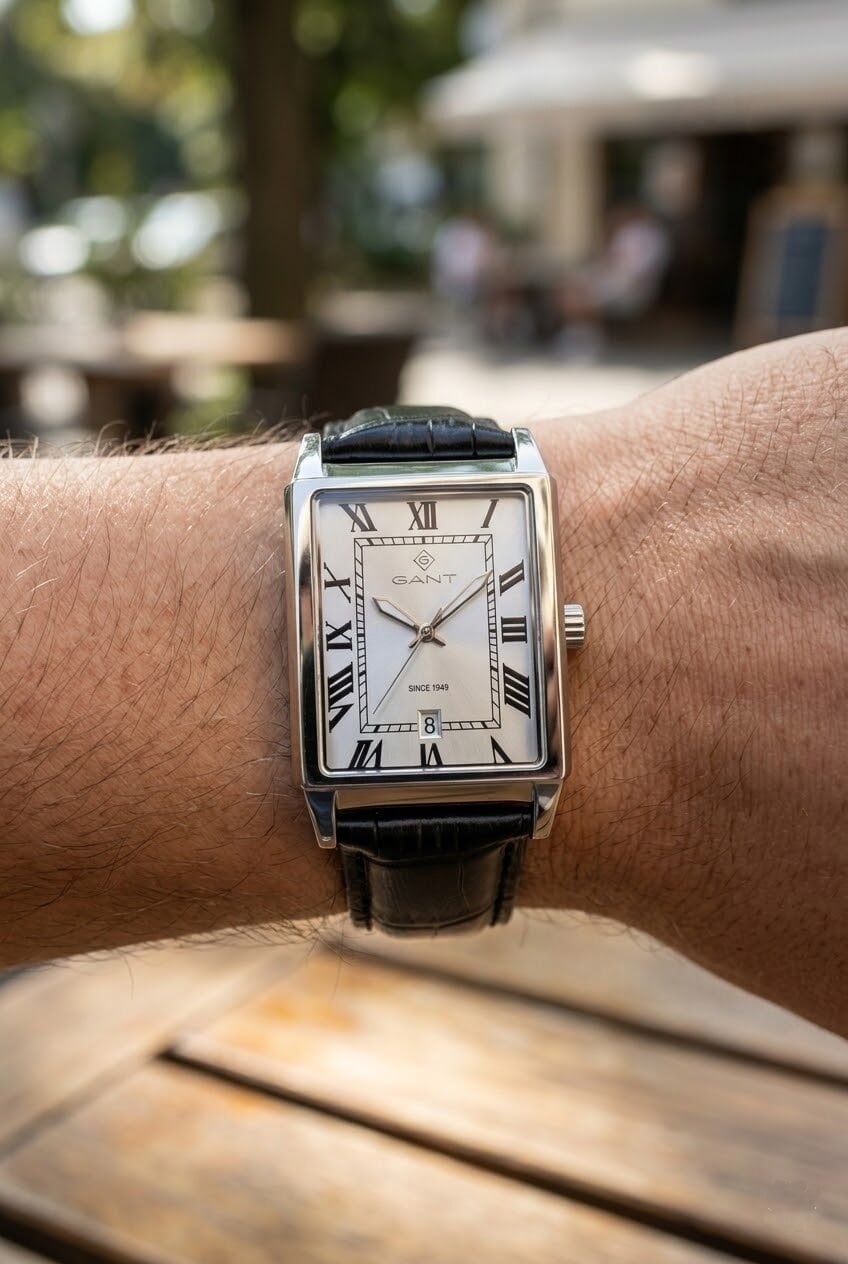 Gant erkek kol saati klasik çizgileri ve dikdörtgen kasa formu ile zamansız bir şıklık sunar. Beyaz kadran üzerindeki Roma rakamları ve ince detaylar modele sofistike bir hava kazandırır. Siyah deri kordon ile tamamlanan tasarım, klasik ve resmi kombinlerde mükemmel bir uyum sağlar.