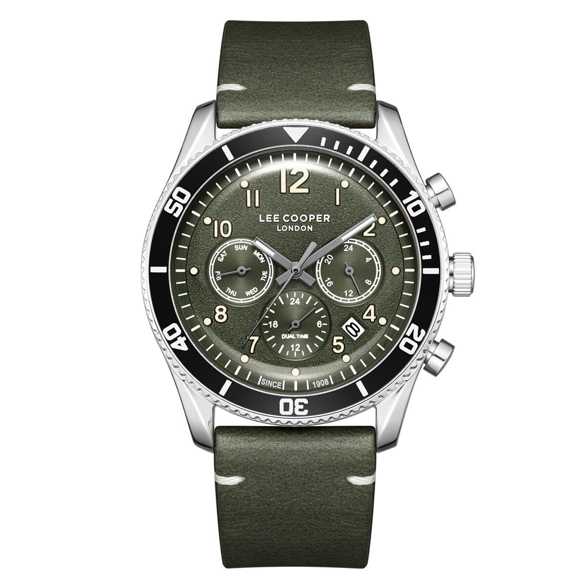 Lee Cooper 41mm Çelik Kasa, Haki Deri Kordon, Multifonksiyon Erkek Kol Saati
