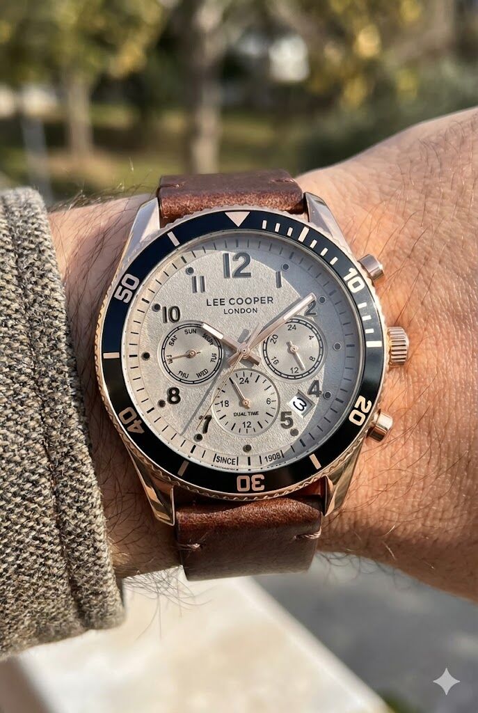Lee Cooper erkek kol saati; rose gold tonlu paslanmaz çelik kasası ve kahverengi deri kordonu ile klasik ve sportif tarzı bir arada sunar. Çok fonksiyonlu kadran yapısı hem estetik bir görünüm hem de günlük kullanımda pratiklik sağlar. Zarif detayları ve güçlü tasarımıyla hem günlük kombinlerde hem de şık davetlerde stilinizi tamamlayan özel bir modeldir.