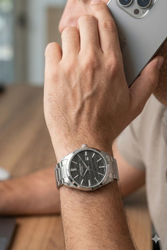 Siyah dokulu kadran yüzeyi güçlü ve maskülen bir karakter kazandırır. Gümüş tonlu indeks ve akrep-yelkovan detayları yüksek okunabilirlik sağlar. Modern çizgileri sayesinde hem iş hayatında hem günlük kullanımda rahatlıkla tercih edilebilir.