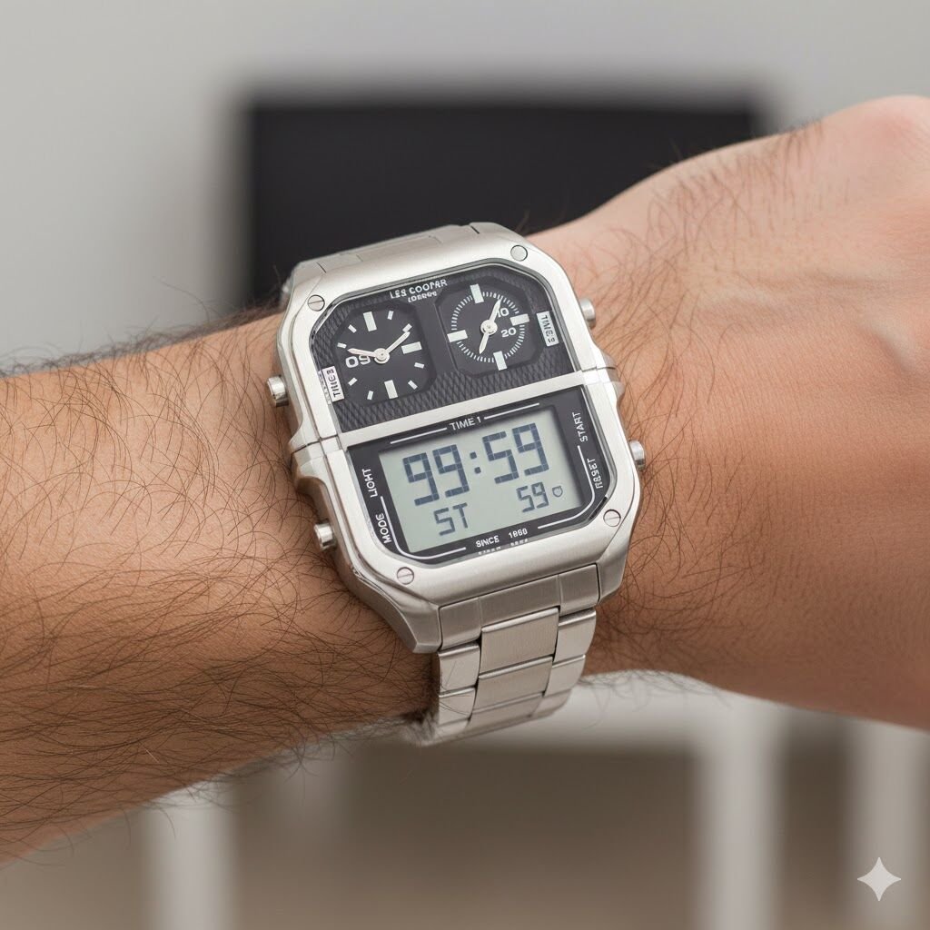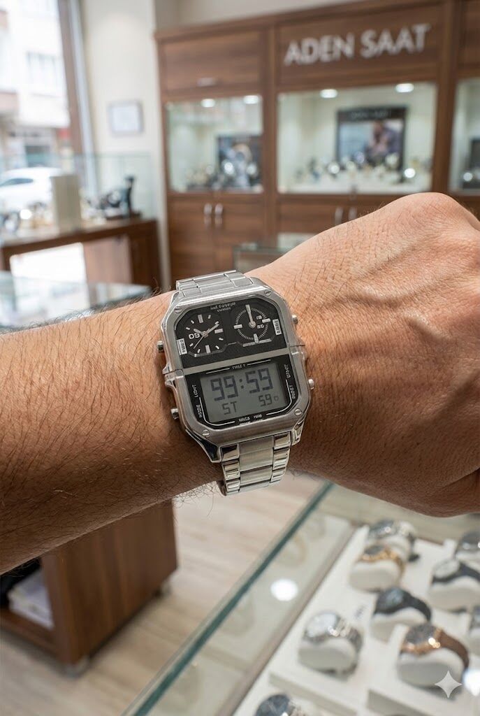 Üst bölümde analog kadran, alt bölümde dijital ekran yer alır. Çok fonksiyonlu yapısı sayesinde hem klasik saat görünümü hem de dijital kullanım kolaylığı sunar. Büyük kasa tasarımı, saatin bilekte güçlü bir duruş sergilemesini sağlar.