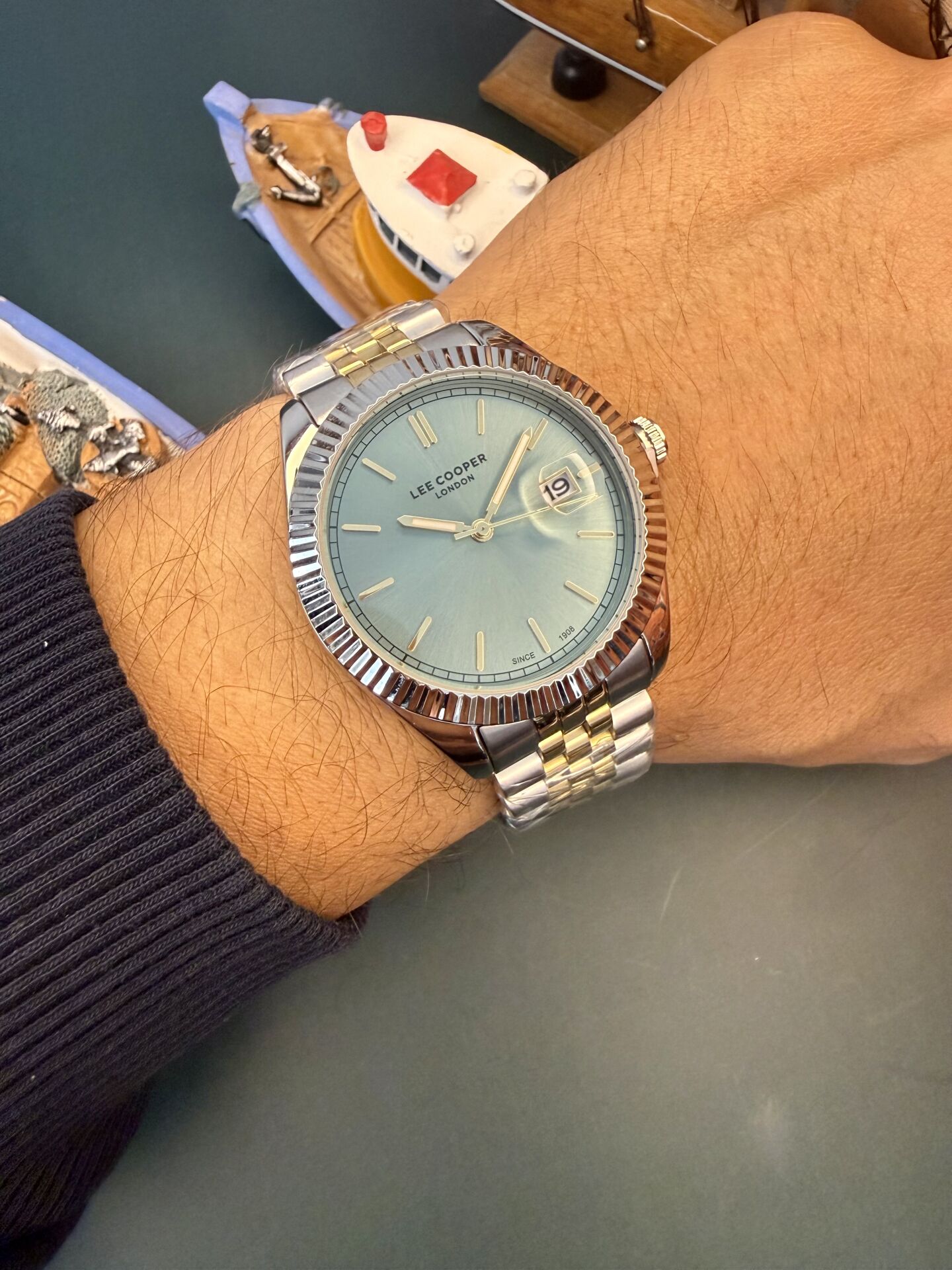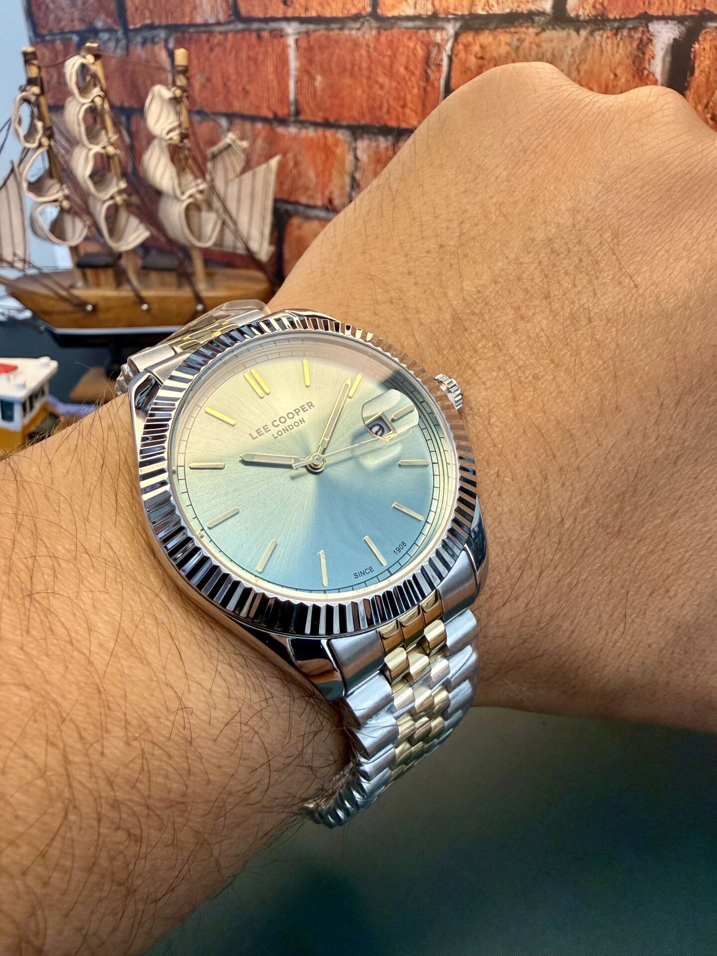 Lee Cooper Erkek Kol Saati; klasik fluted bezel tasarımı, yeşil kadranı ve altın–gri tonlu çelik kordonuyla zamansız bir şıklık sunar. Günlük kullanımda rahatlık sağlayan quartz mekanizması ve tarih göstergesiyle hem fonksiyonel hem de estetik bir tercih oluşturur.