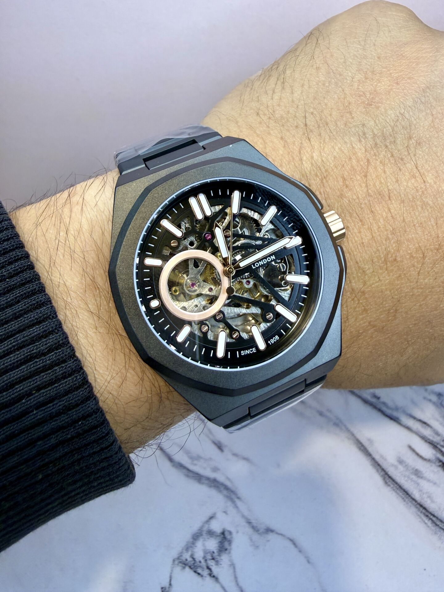 İskelet kadran tasarımı, saatin mekanik yapısını estetik bir biçimde ortaya çıkarır. Rose gold tonlu akrep ve yelkovan detayları, siyah kasa ve kordonla güçlü bir kontrast oluşturur. Modern ve iddialı tasarımıyla hem günlük hem de özel kombinlere uyum sağlar.