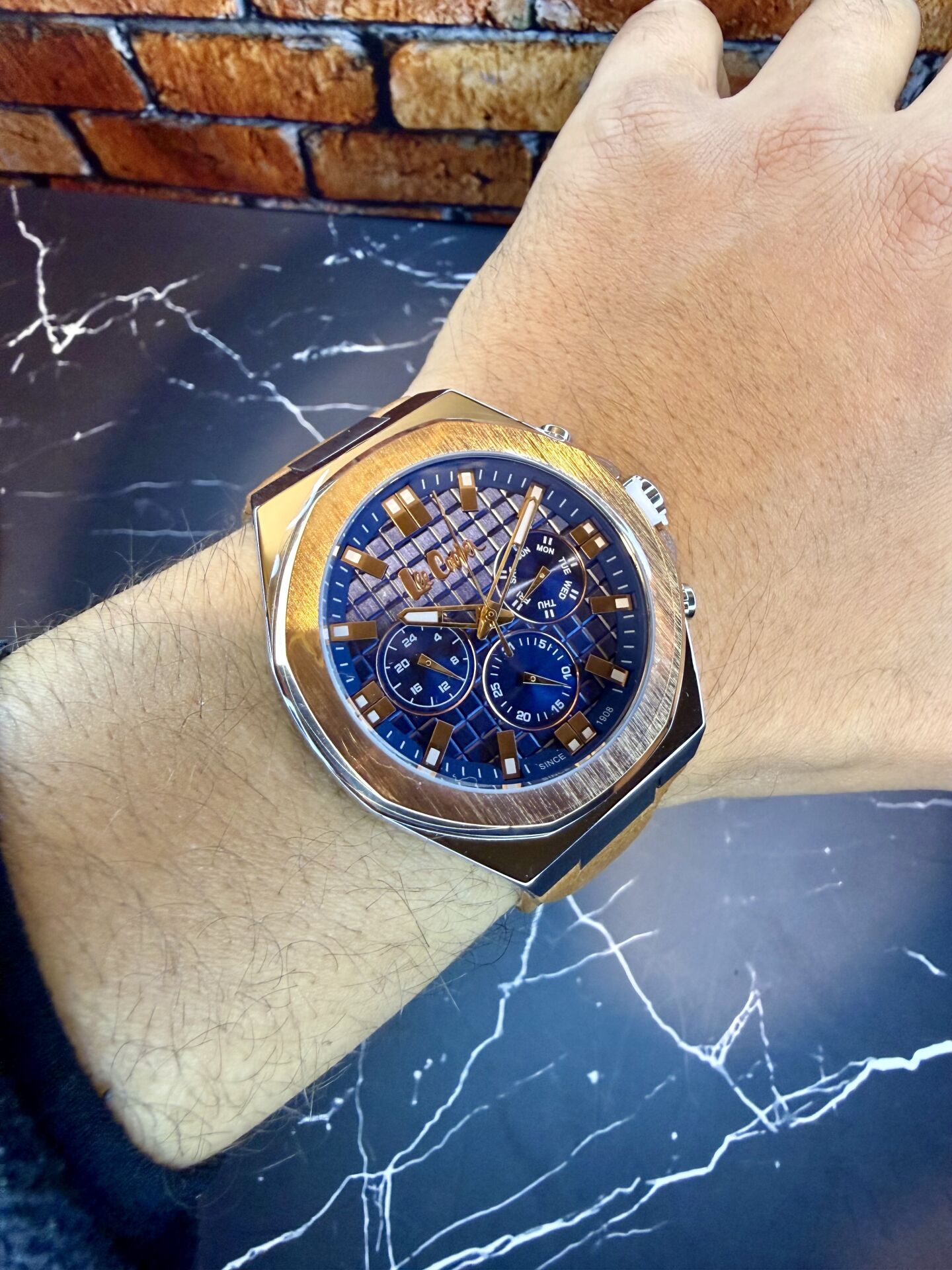 Lacivert kadran üzerinde yer alan rose gold tonlu indeksler ve fonksiyon göstergeleri, saate güçlü ve sofistike bir karakter kazandırır. Sekizgen kasa formu modern ve maskülen bir duruş sunar.