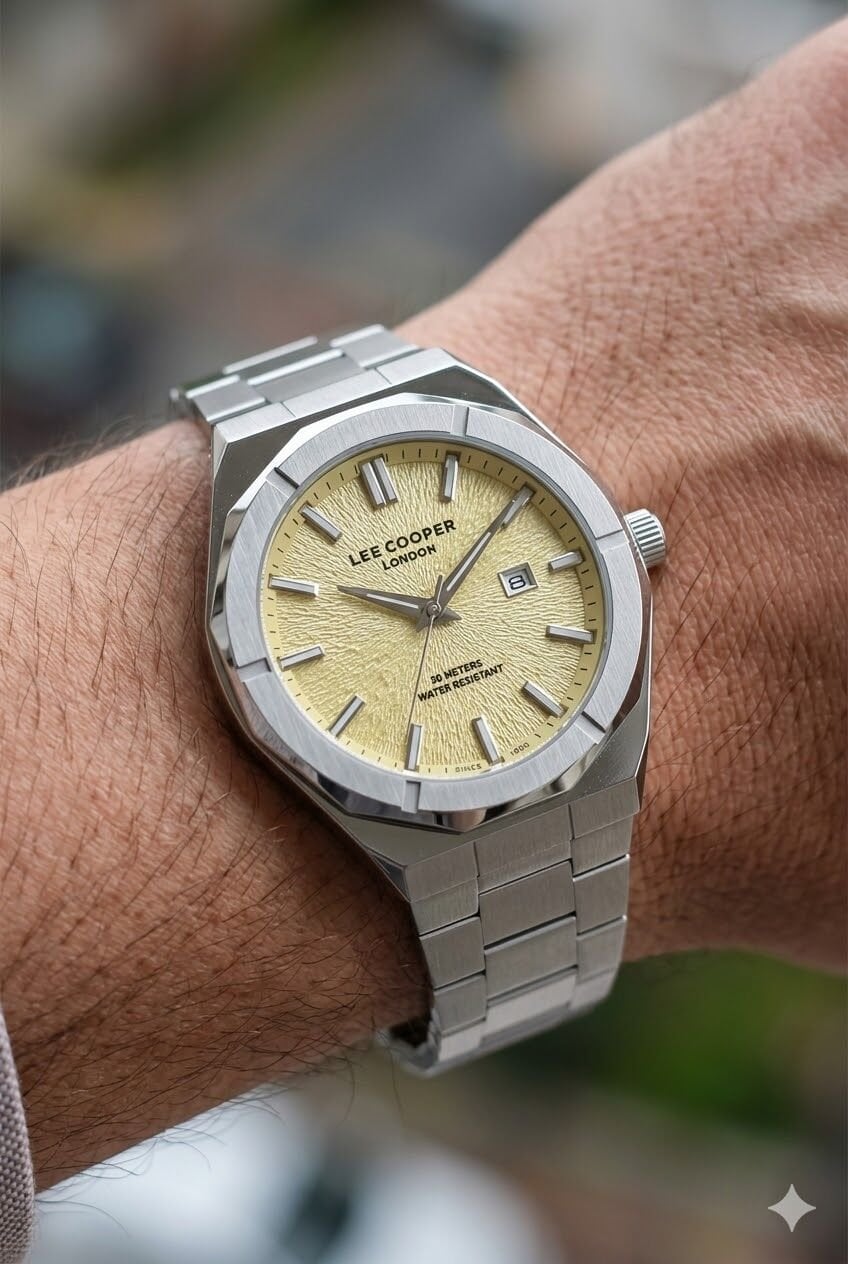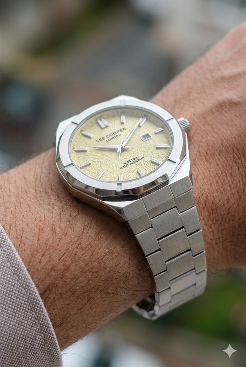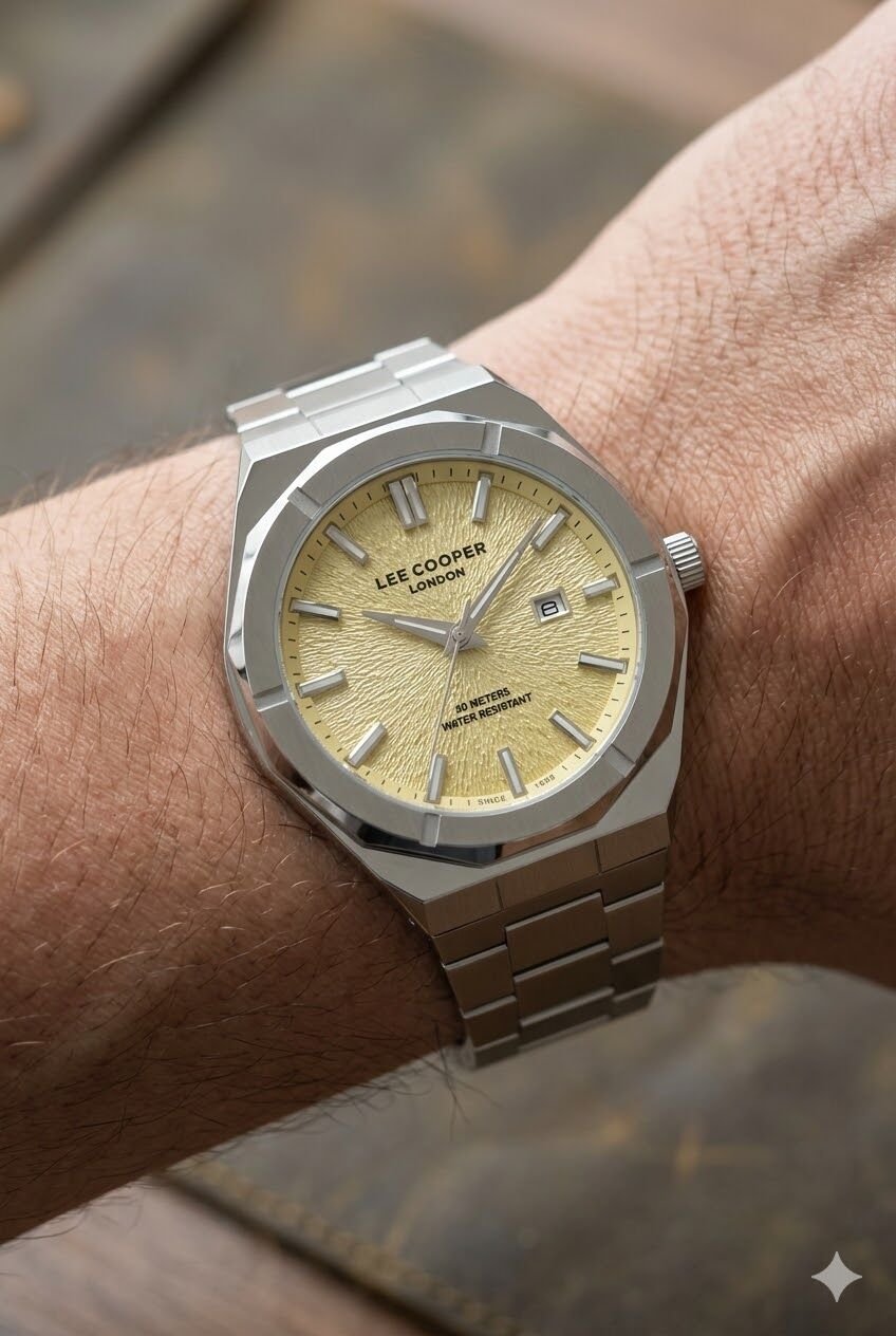 Lee Cooper erkek kol saati sade ve güçlü çizgileriyle zamansız bir stil sunar. Altın kadran üzerinde yer alan indeksler ve tarih göstergesi, modele hem şık hem de fonksiyonel bir karakter kazandırır. Gümüş çelik bilezik ile tamamlanan tasarım, günlük kombinlerden özel davetlere kadar geniş kullanım alanı sunar.