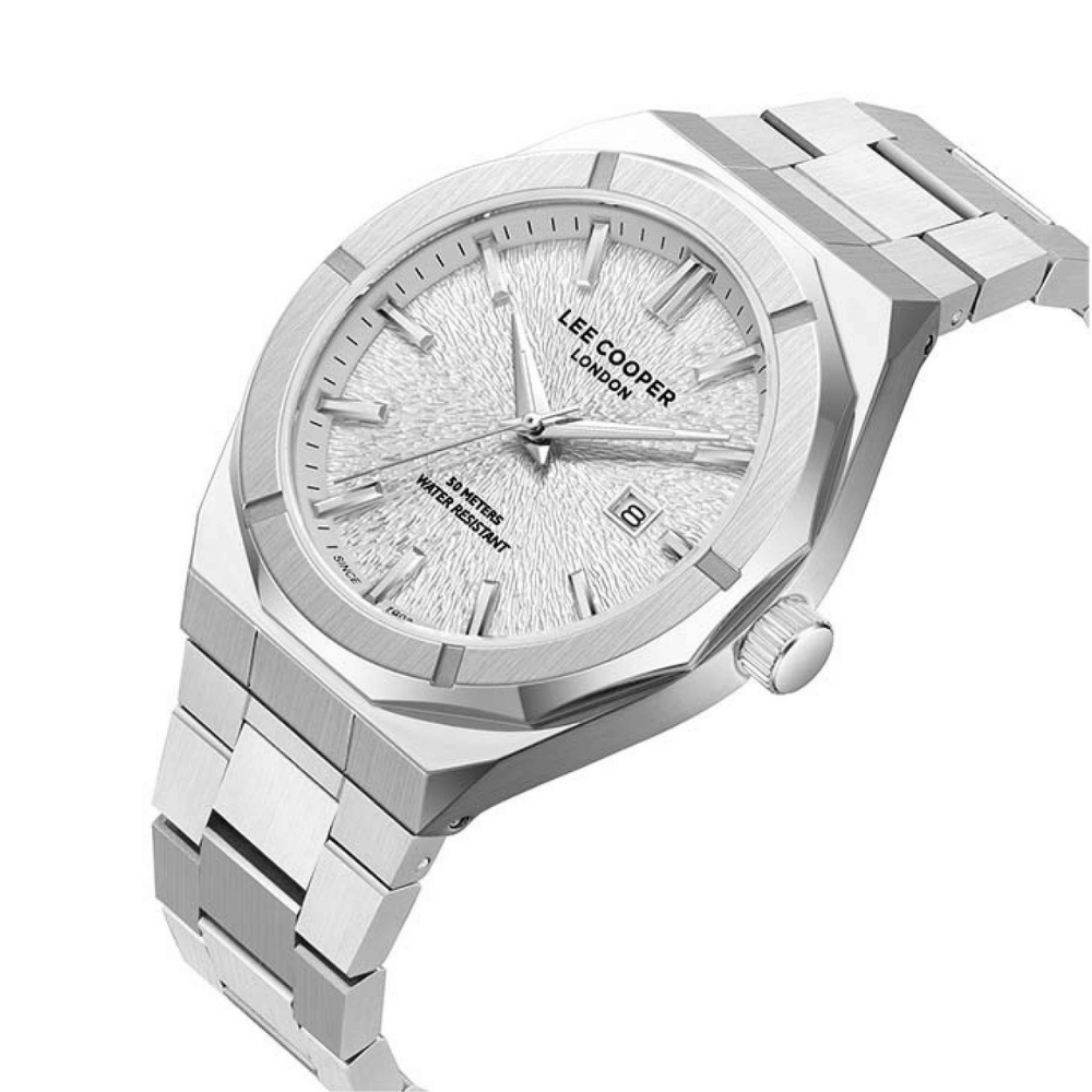 Lee Cooper erkek kol saati monokrom gümüş tasarımıyla sade ve şık bir görünüm sunar. Gümüş kadran üzerinde yer alan indeksler ve tarih göstergesi, modele fonksiyonel ve modern bir karakter kazandırır. Minimal tasarımı sayesinde hem günlük kullanım hem de klasik kombinler için ideal bir tercihtir.