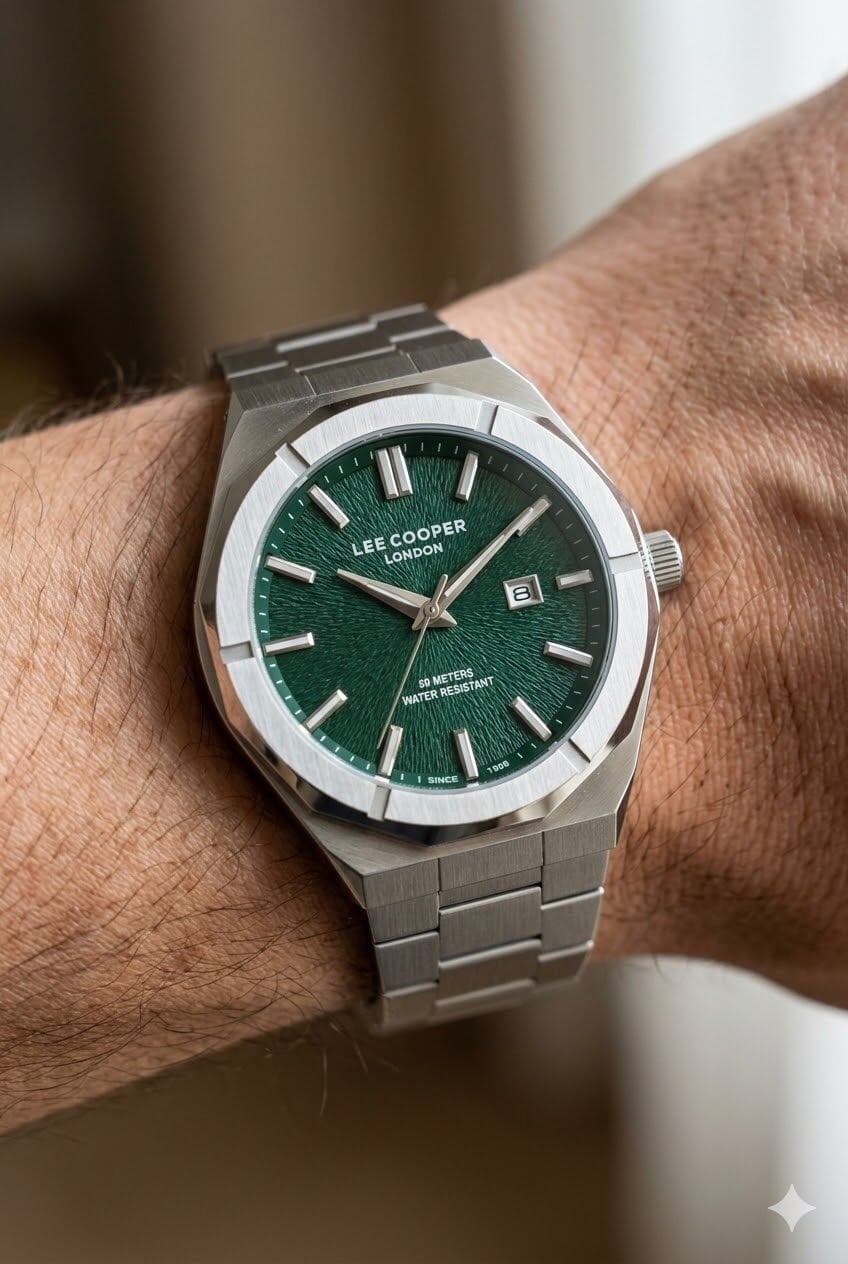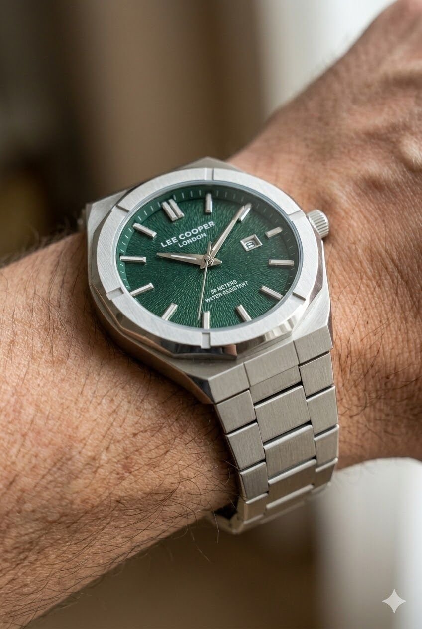 Lee Cooper erkek kol saati sade ve güçlü çizgileriyle zamansız bir stil sunar. Yeşil kadran üzerinde yer alan indeksler ve tarih göstergesi, modele hem şık hem de fonksiyonel bir karakter kazandırır. Gümüş çelik bilezik ile tamamlanan tasarım, günlük kombinlerden özel davetlere kadar geniş kullanım alanı sunar.