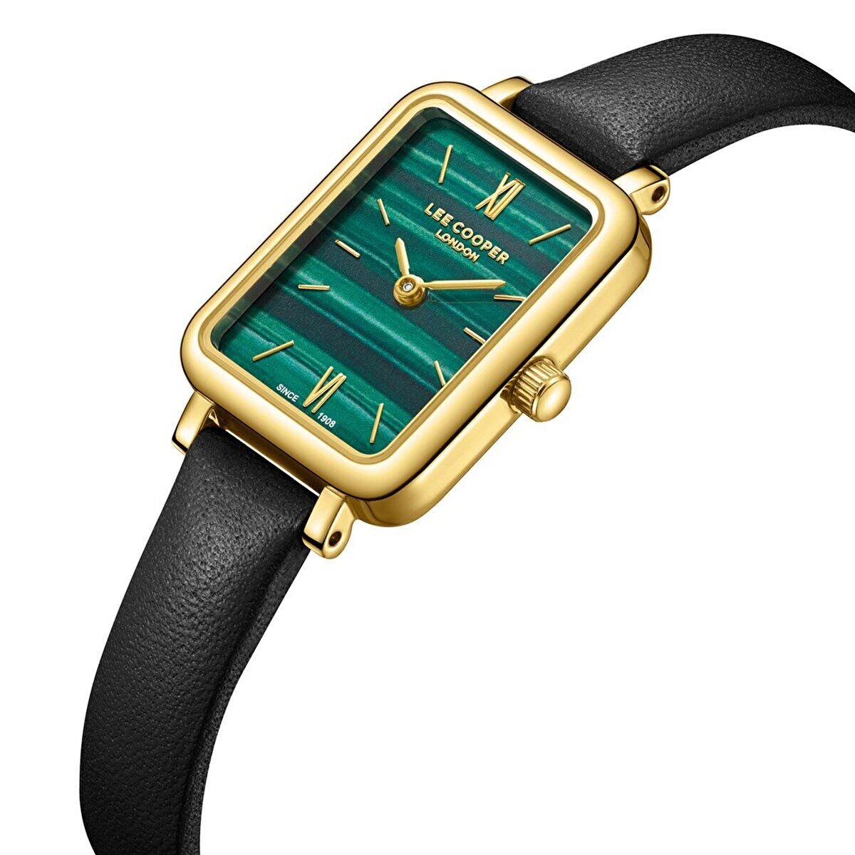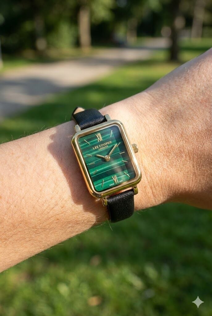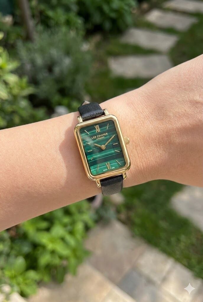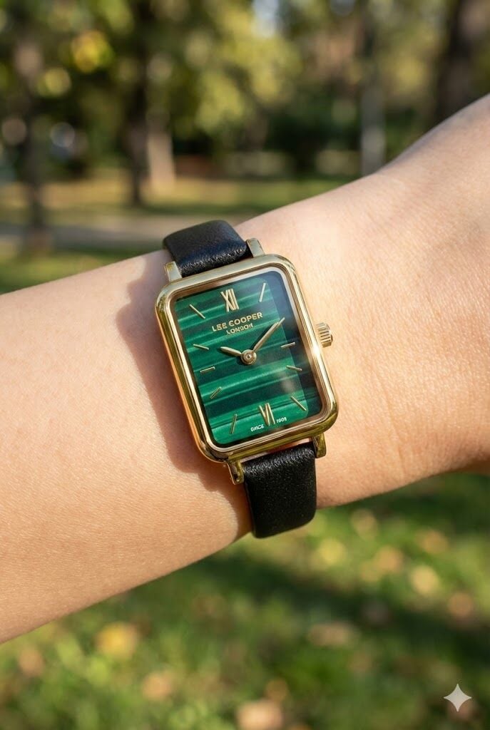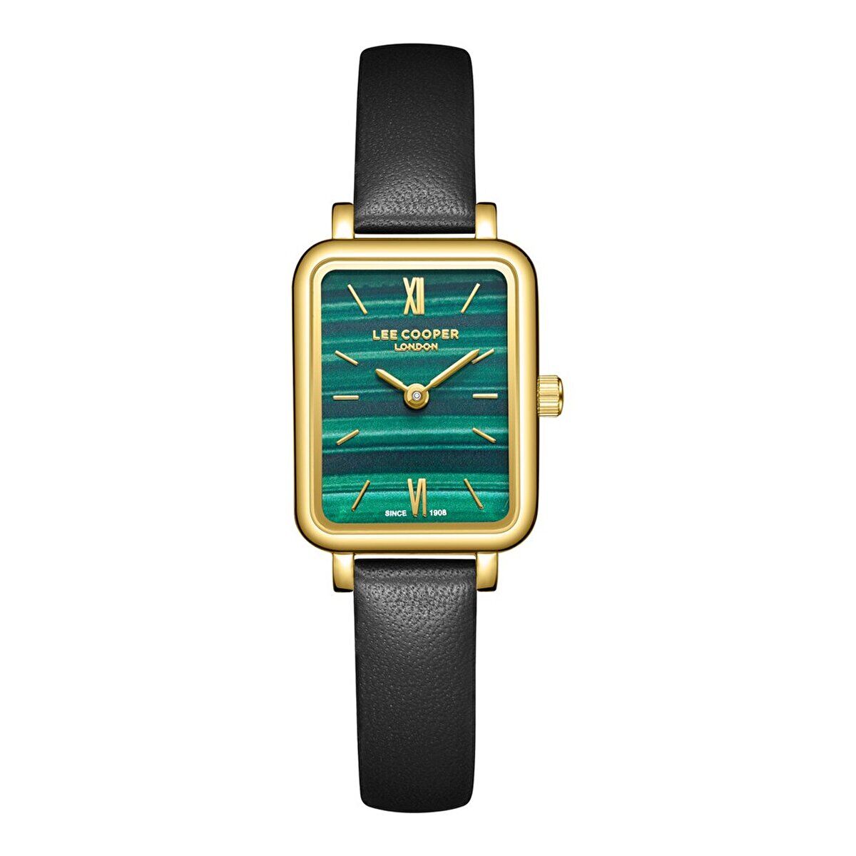 Lee Cooper kadın kol saati, koyu yeşil tonlu özel dokulu kadranı ve zarif dikdörtgen kasa formu ile sofistike bir stil sunar. Altın renk kasa ve siyah deri kordon uyumu, klasik ve modern kombinleri tamamlayan güçlü bir görünüm sağlar.