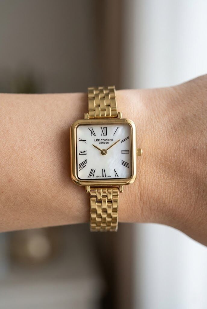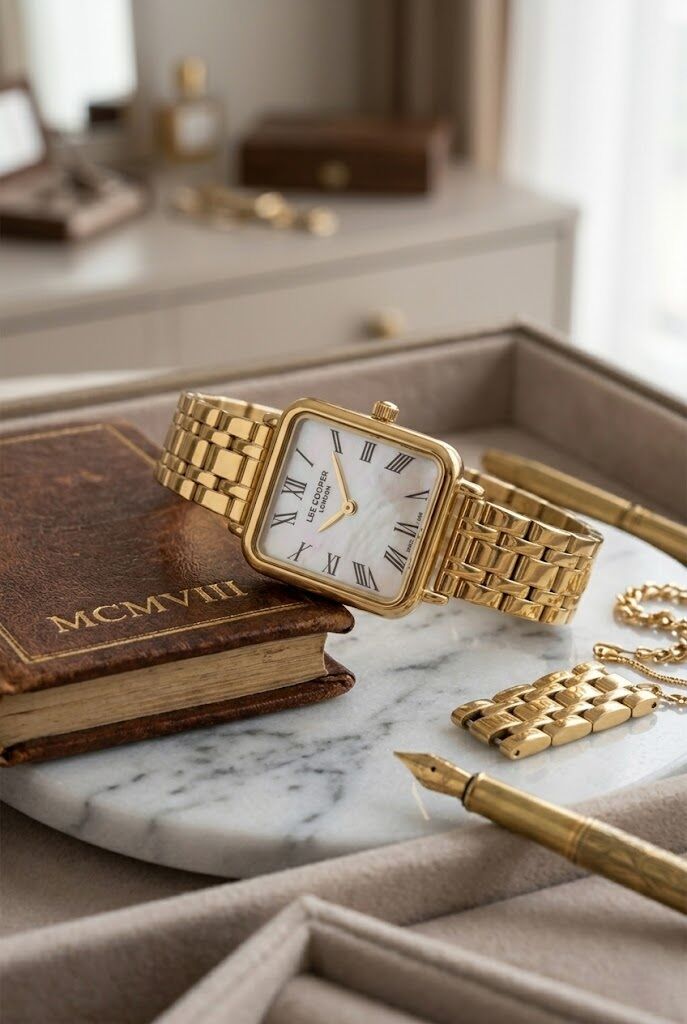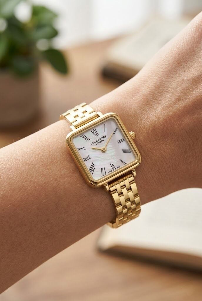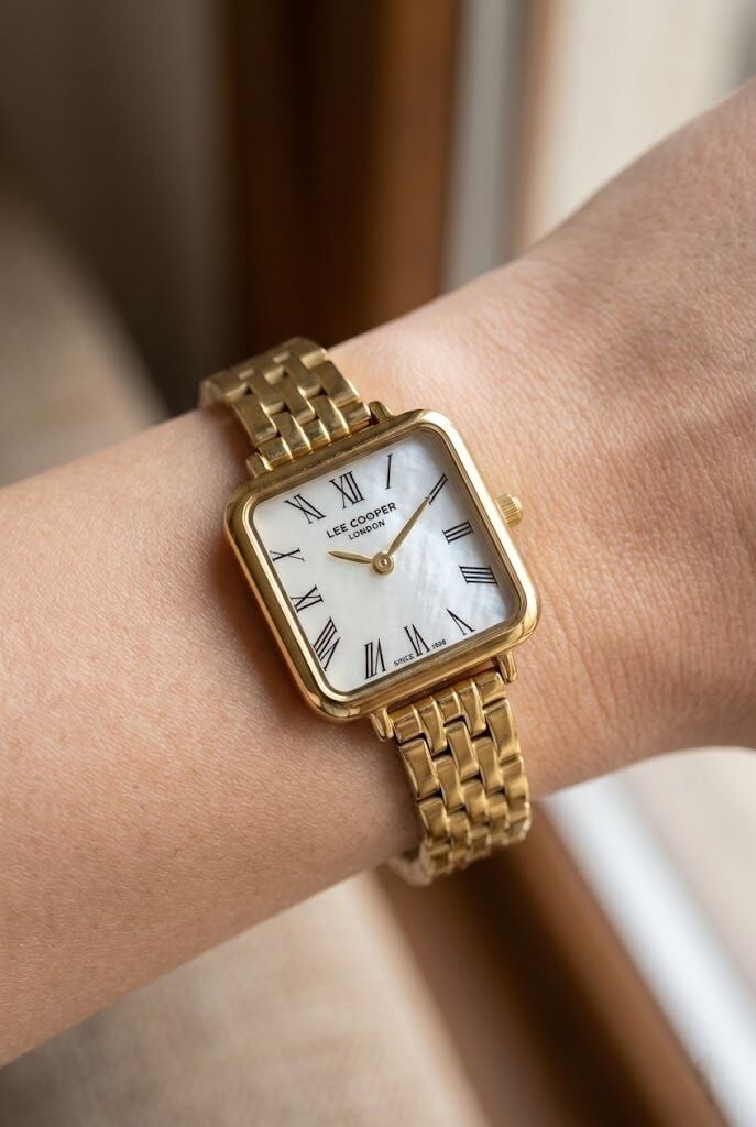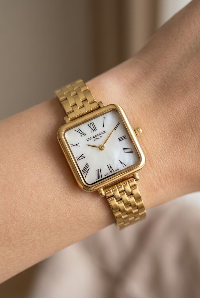 Lee Cooper kadın kol saati, sade ama dikkat çekici tasarımı ile öne çıkar. Kare kasa formu klasik saat anlayışına farklı bir dokunuş katarken, gold tonlar sayesinde zarif ve şık bir stil sunar. İnce bilek yapısına uyum sağlayan kompakt tasarımı ile konforlu kullanım sağlar.