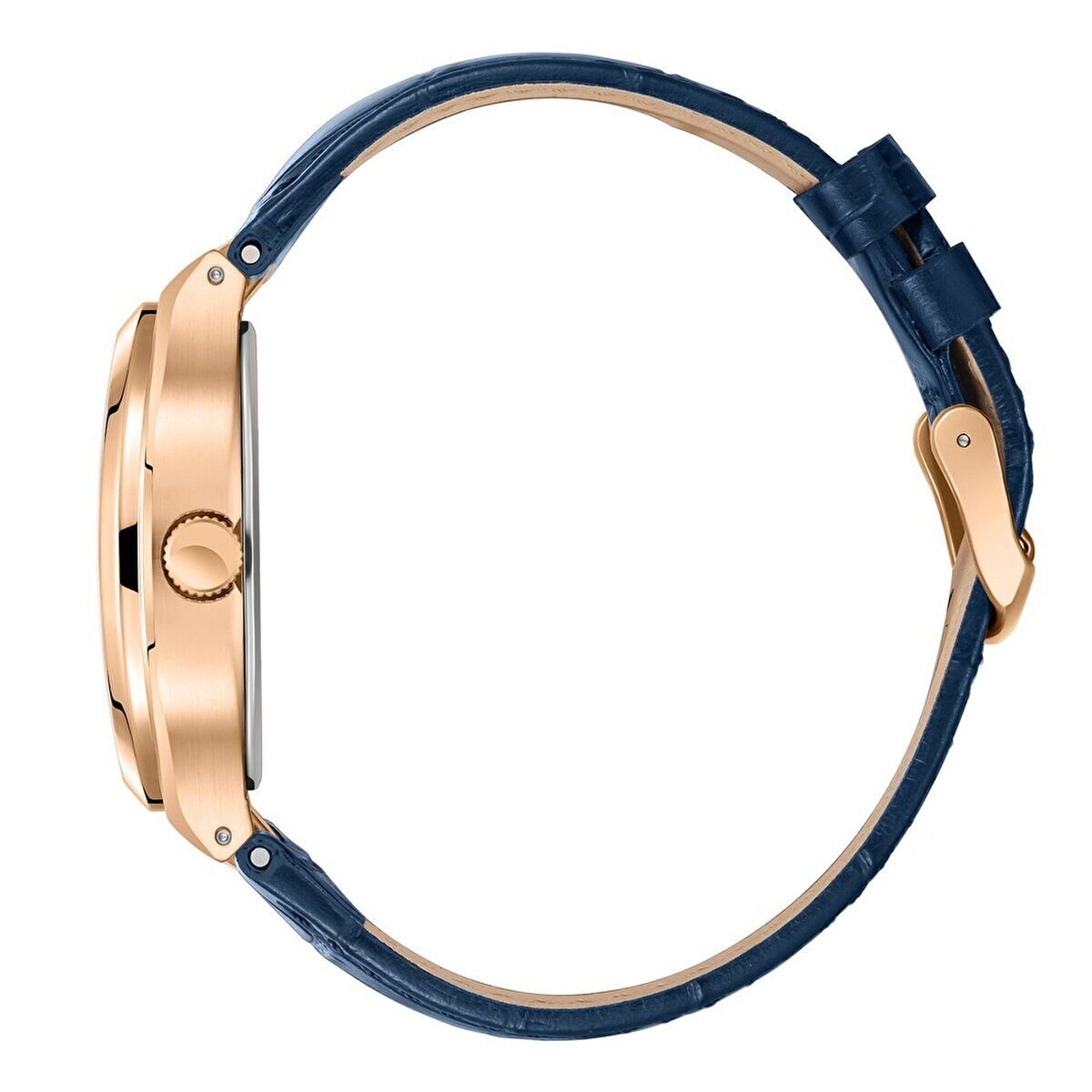 Kareye yakın modern kasa formu, rose gold renk kaplama ile birleşerek saate güçlü ve sofistike bir karakter kazandırır. Lacivert kadran üzerindeki net indeksler ve tarih göstergesi, estetik ile fonksiyonelliği bir arada sunar.