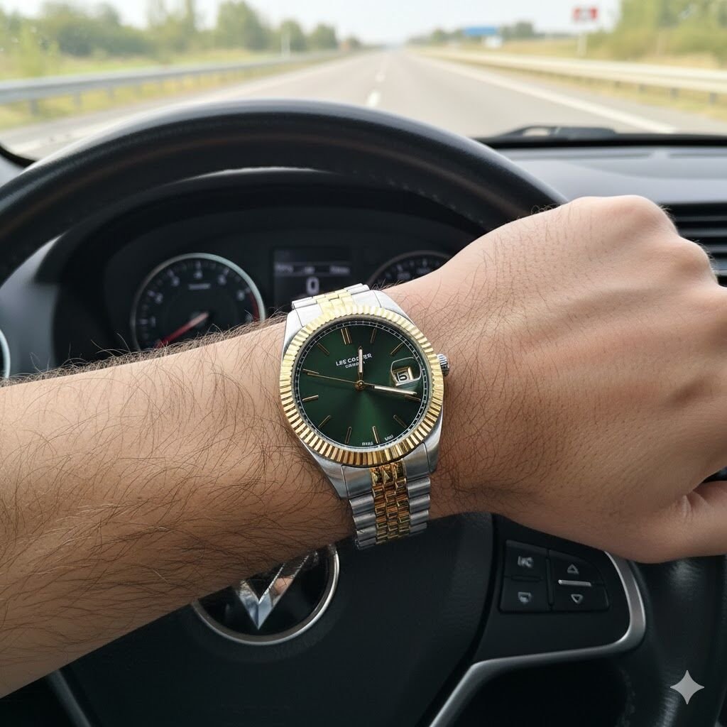 İki tonlu çelik kasa ve altın tırtıklı bezel, modele güçlü ve dikkat çekici bir görünüm kazandırır. Yeşil kadran üzerindeki gold indeks ve kollar premium bir kontrast oluşturarak saatin şıklığını artırır.