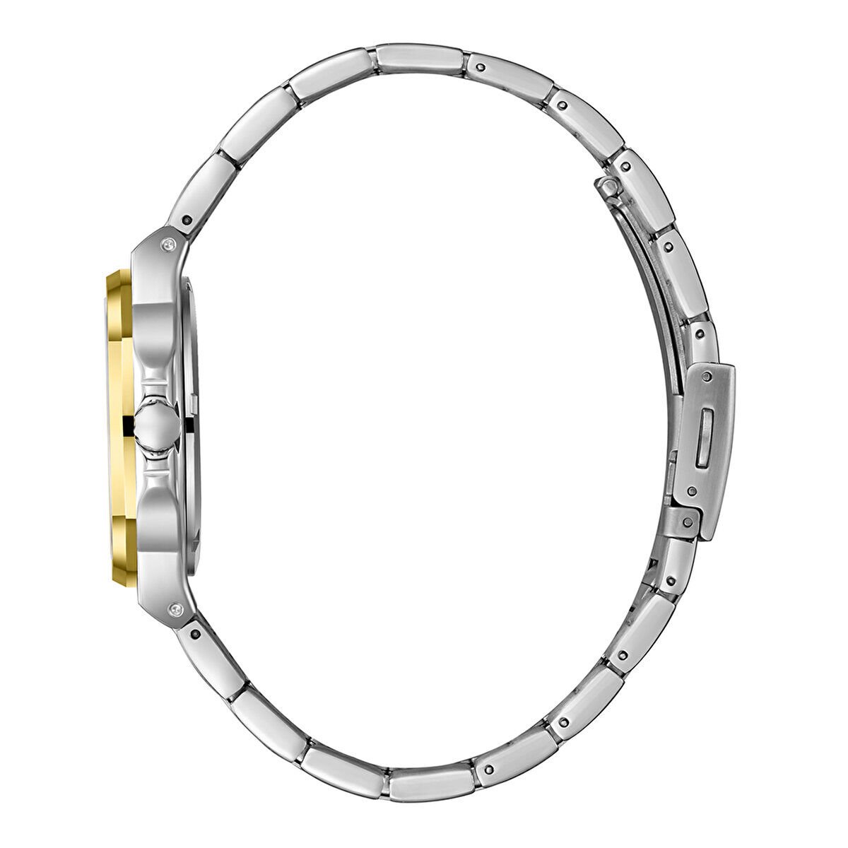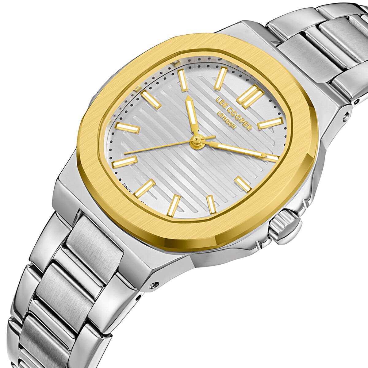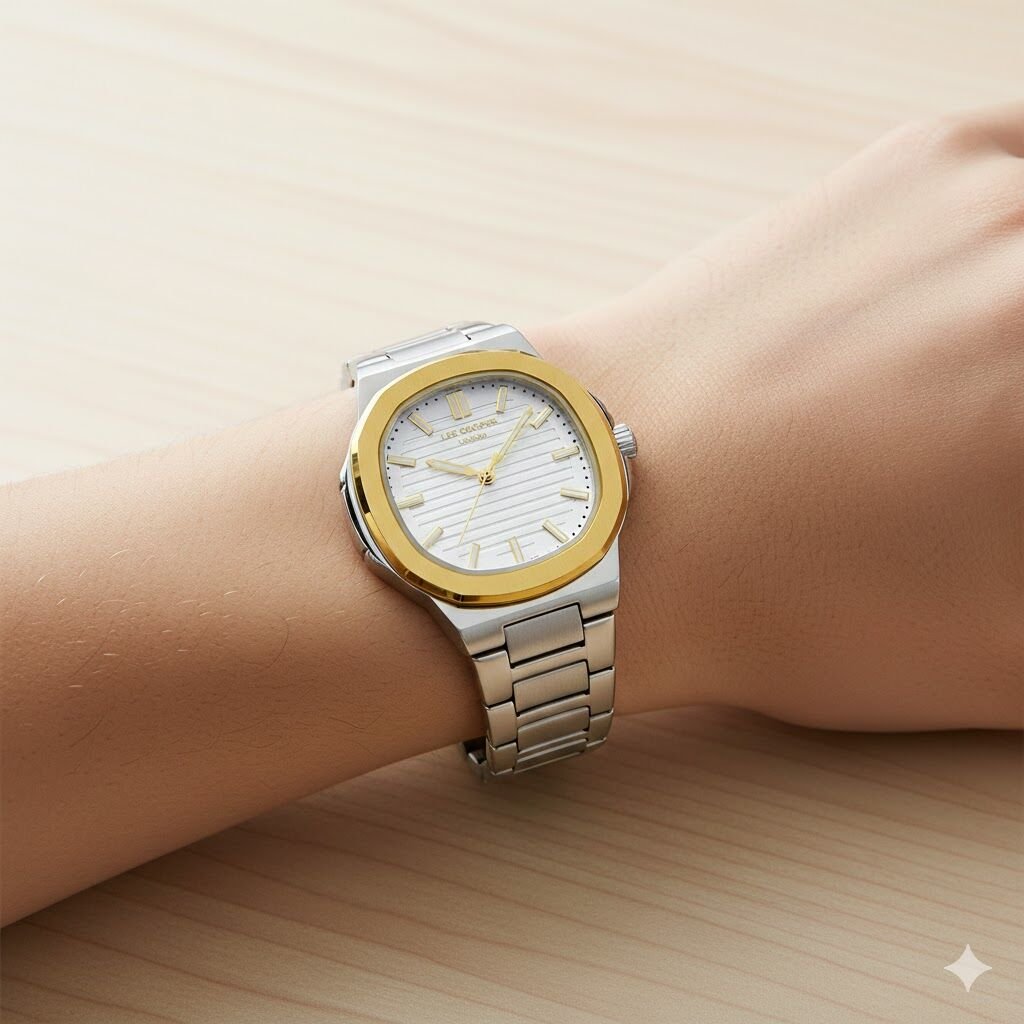 Model, gümüş kasaya kontrast oluşturan altın renkli bezel ile hem modern hem de dikkat çekici bir görünüm sunar. Kadran üzerindeki yatay çizgi dokusu ışığı şık bir şekilde yansıtarak saatin premium duruşunu tamamlar.