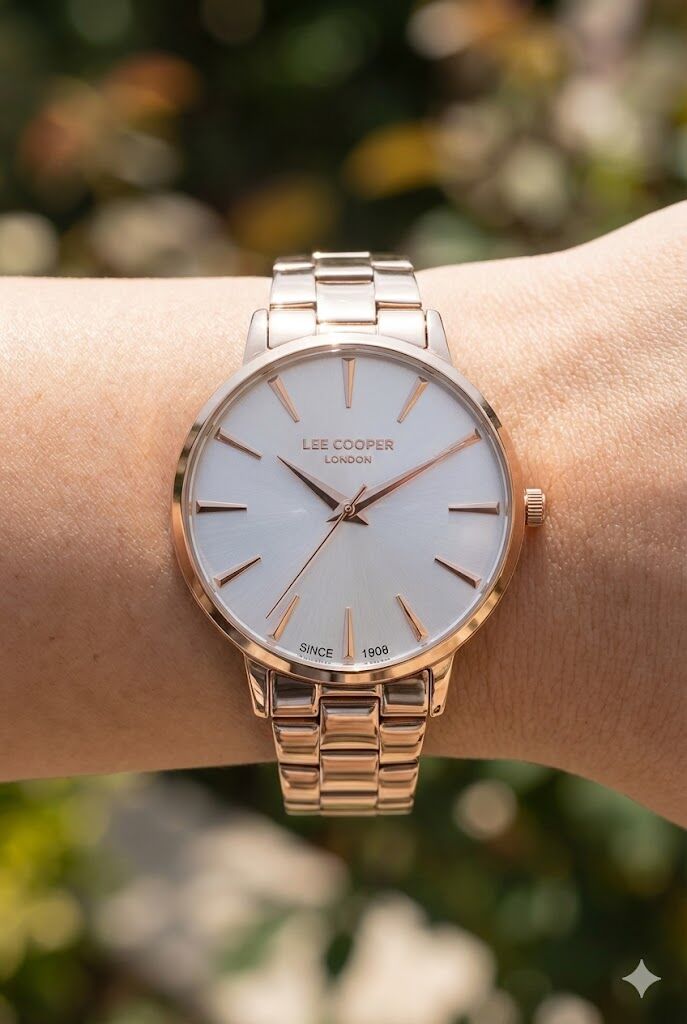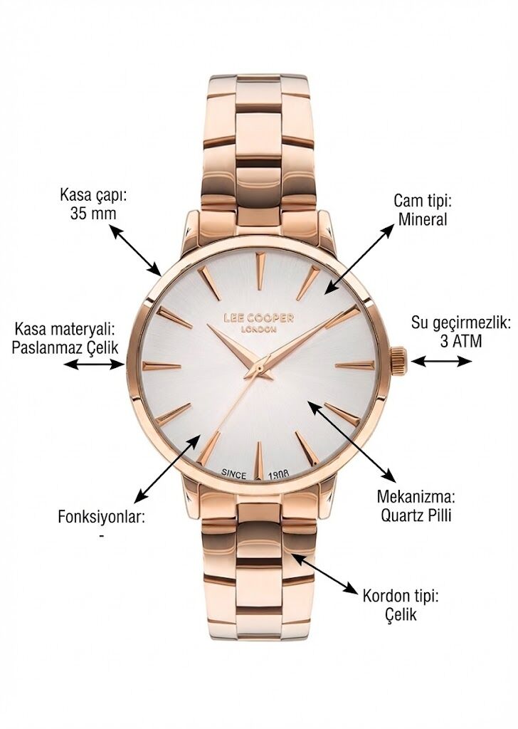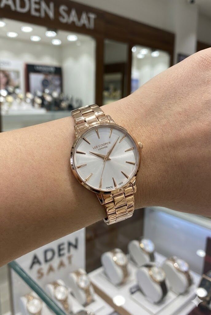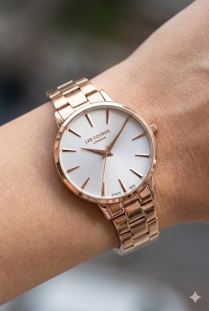 Lee Cooper kadın kol saati, pembe altın tonlu çelik kasa ve kordonu ile zarif ve modern bir görünüm sunar. Gümüş renk kadranı ve sade indeks tasarımı sayesinde günlük kullanımda ve klasik kombinlerde şıklığı tamamlar.
