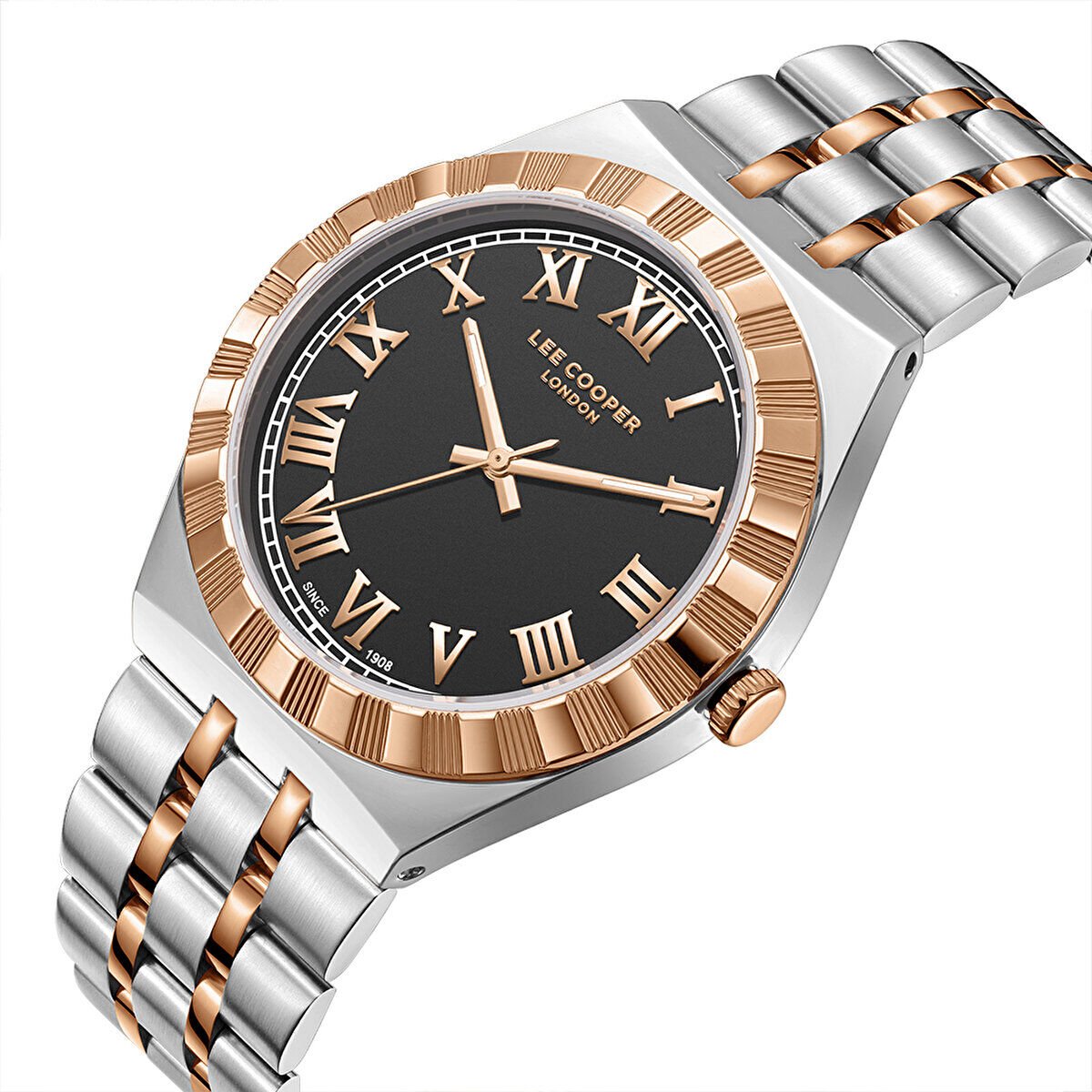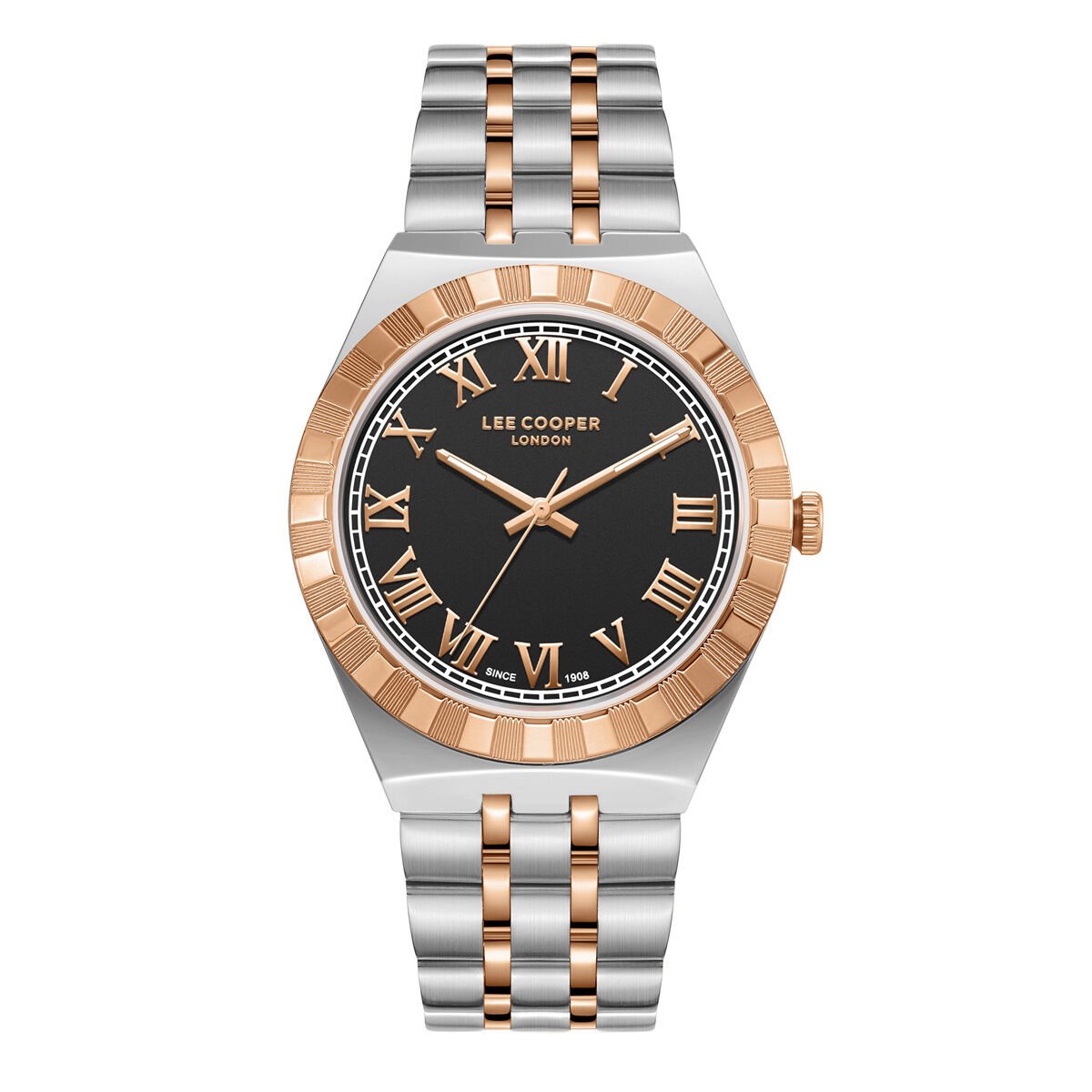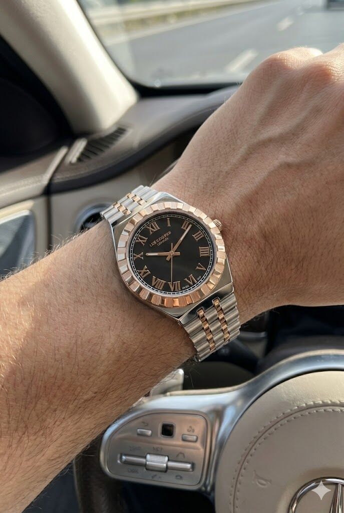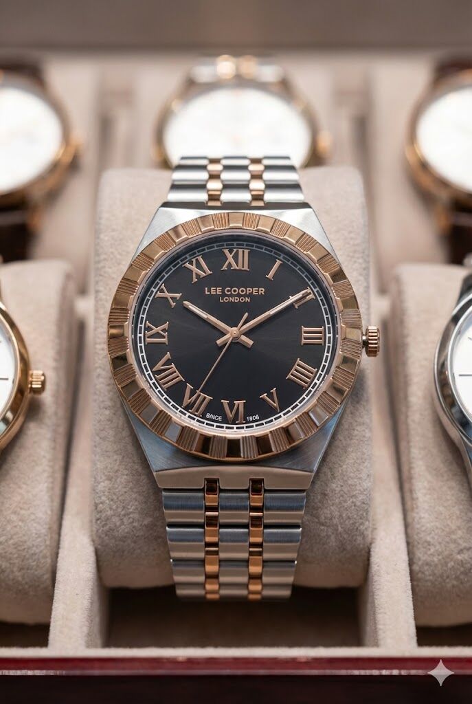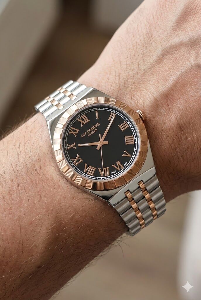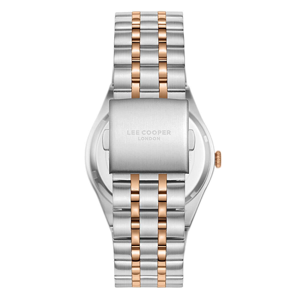 Lee Cooper erkek kol saati, çelik kasa ve çift renkli çelik kordon tasarımıyla klasik ve modern çizgileri bir araya getirir. Siyah kadranı üzerinde yer alan Roma rakamlı indeksler ve rose detaylı bezel, saate güçlü ve prestijli bir görünüm kazandırır. Günlük kullanımda ve şık kombinlerde rahatlıkla tercih edilebilir.