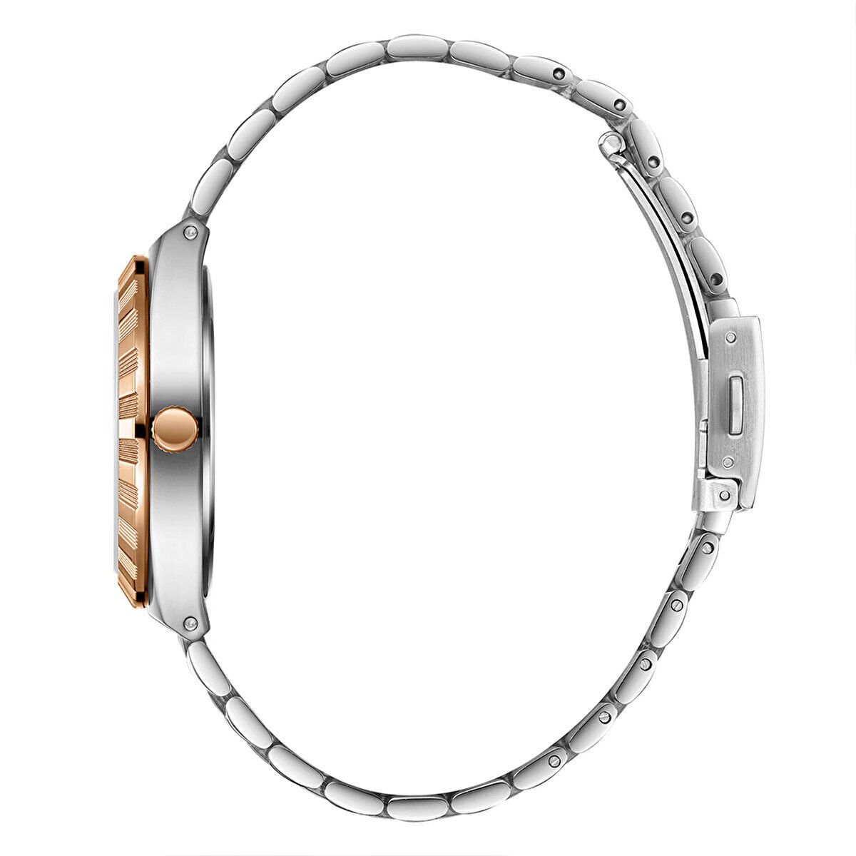 Çift renkli çelik kordon, bilekte sağlam ve konforlu bir kullanım sunar. Ayarlanabilir bakla yapısı sayesinde farklı bilek ölçülerine uyum sağlar.