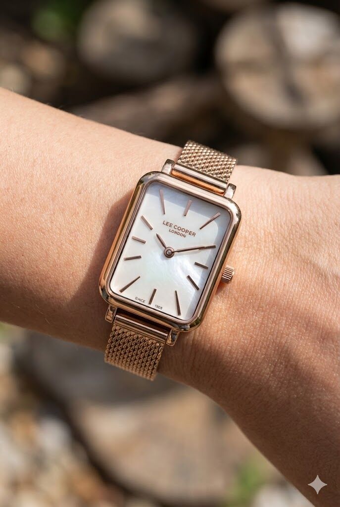 Dikdörtgen kasa formu, rose tonların sıcaklığıyla birleşerek feminen ve modern bir tasarım sunar. İnce indeksler ve sade kadran yapısı, saatin zarafetini ön plana çıkarır.