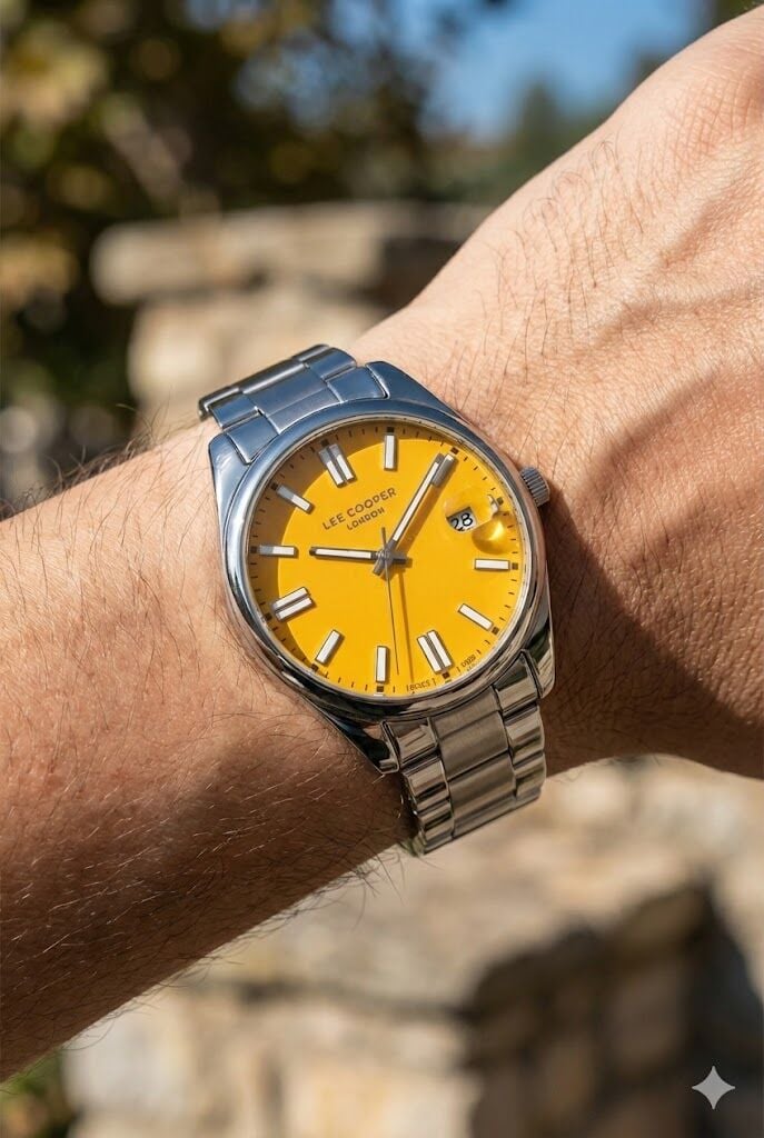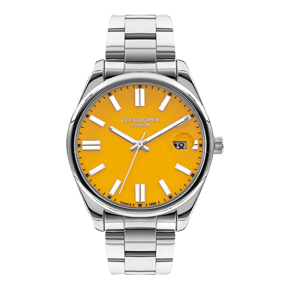 Lee Cooper erkek kol saati, gümüş renk çelik kasa ve çelik kordon yapısıyla güçlü ve modern bir duruş sergiler. Canlı sarı kadranı ve tarih göstergesi ile dikkat çeken bu model, günlük kullanımda ve spor-şık kombinlerde fark yaratmak isteyenler için ideal bir tercihtir.