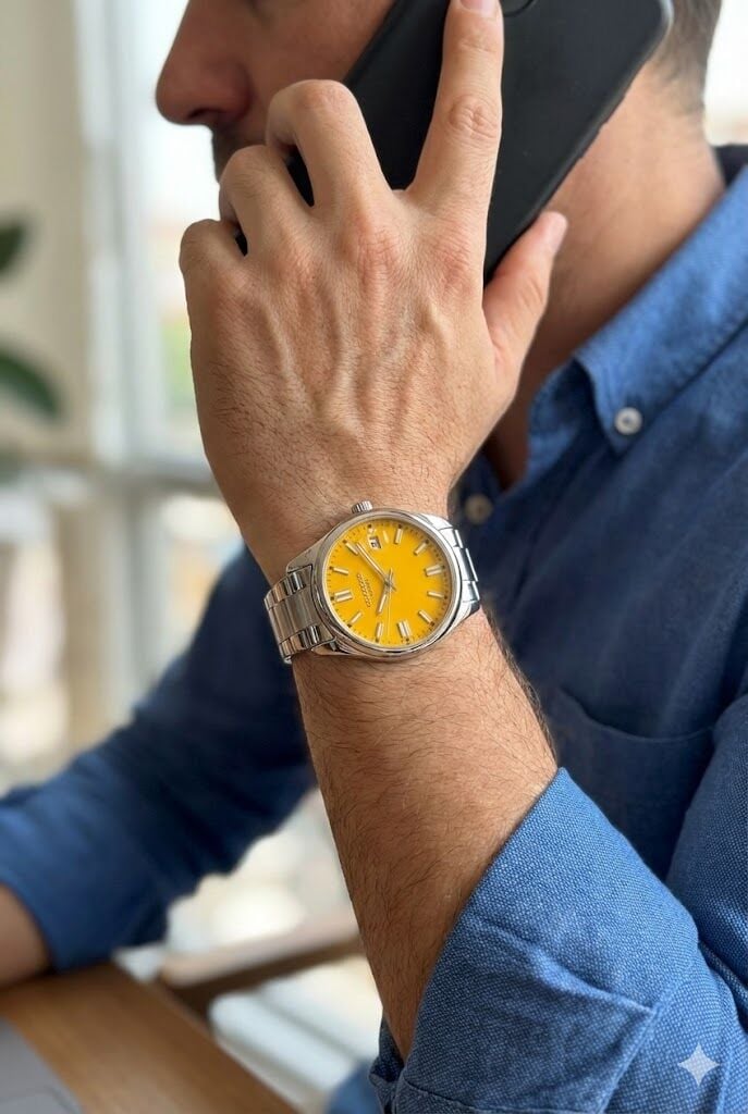 Geniş kasa yapısı ve parlak sarı kadranı ile enerjik ve modern bir tasarım sunar. Net indeksler ve tarih penceresi, hem estetik hem de fonksiyonel kullanım sağlar.
