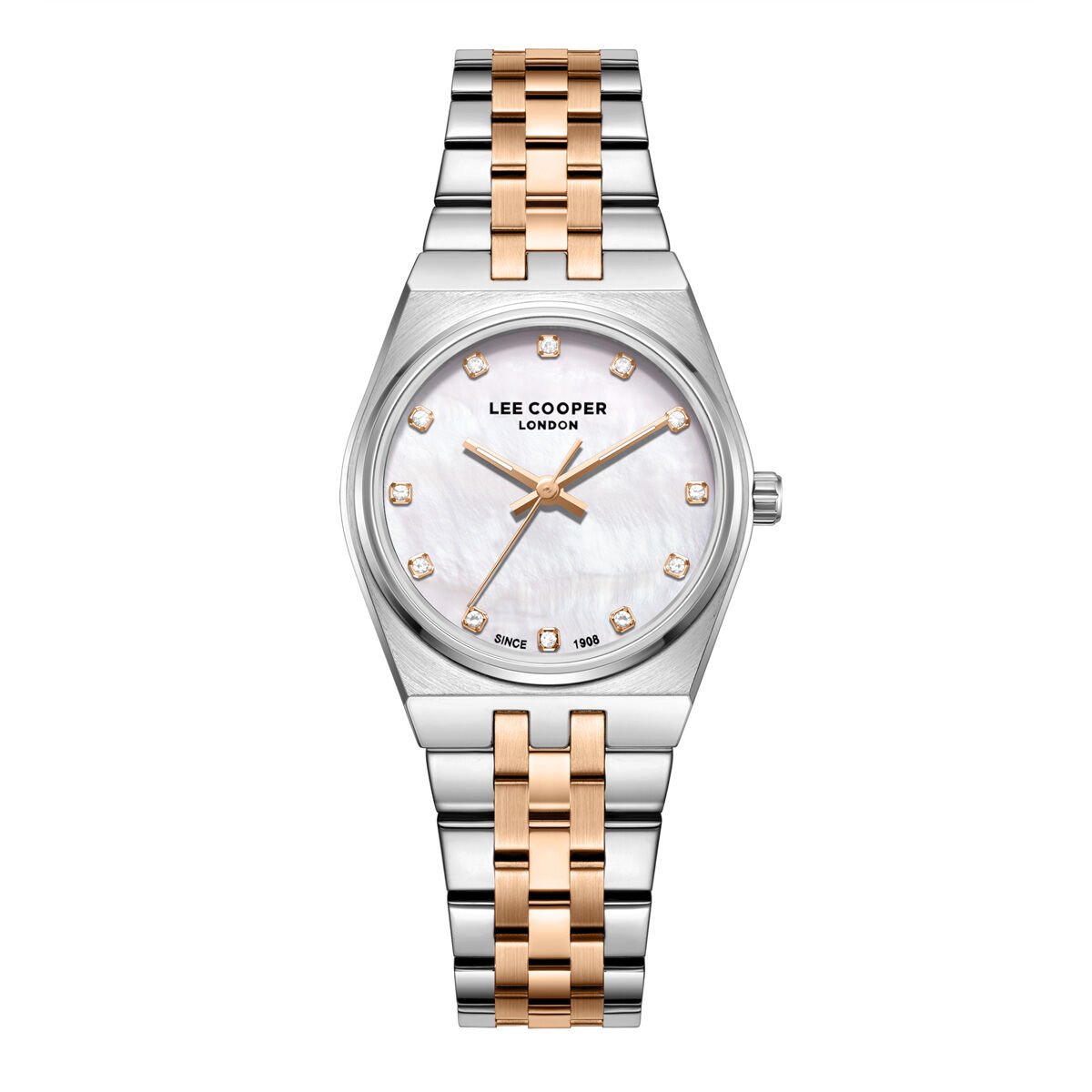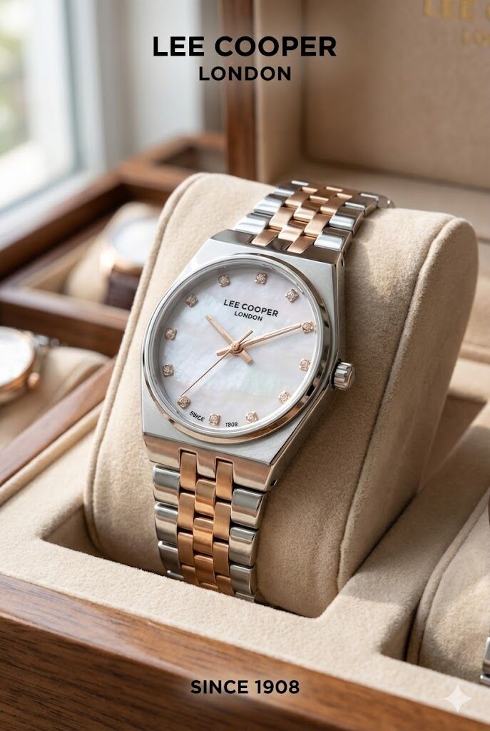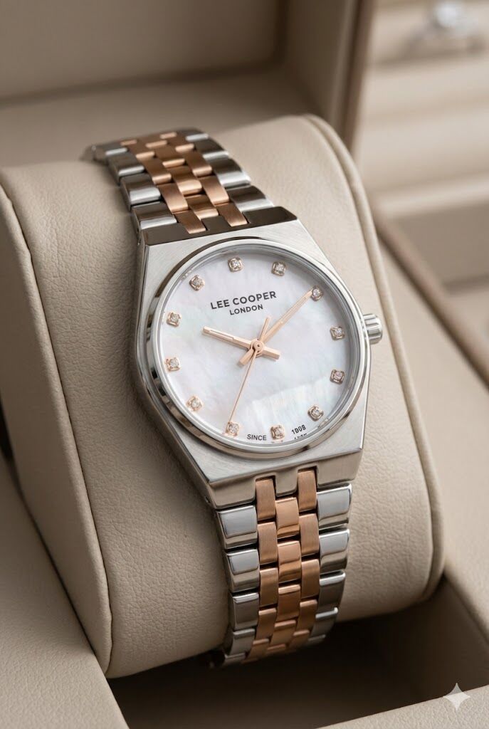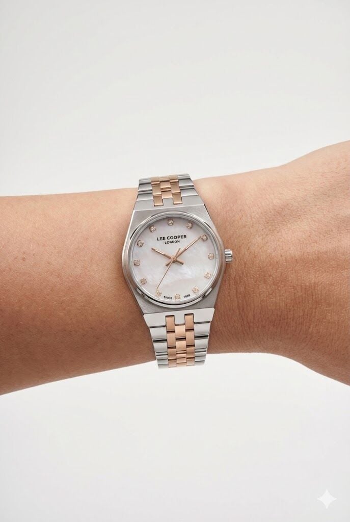 Lee Cooper kadın kol saati, çelik kasa ve çift renkli çelik kordon tasarımıyla zarif ve modern bir stil sunar. Sedef kadranı üzerinde yer alan taş detaylı indeksler, saate feminen ve şık bir dokunuş kazandırır. Günlük kullanımdan özel davetlere kadar geniş bir kullanım alanı sunar.