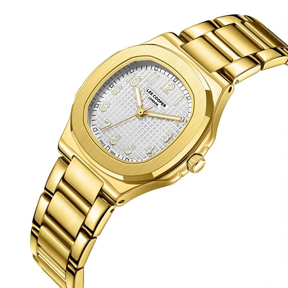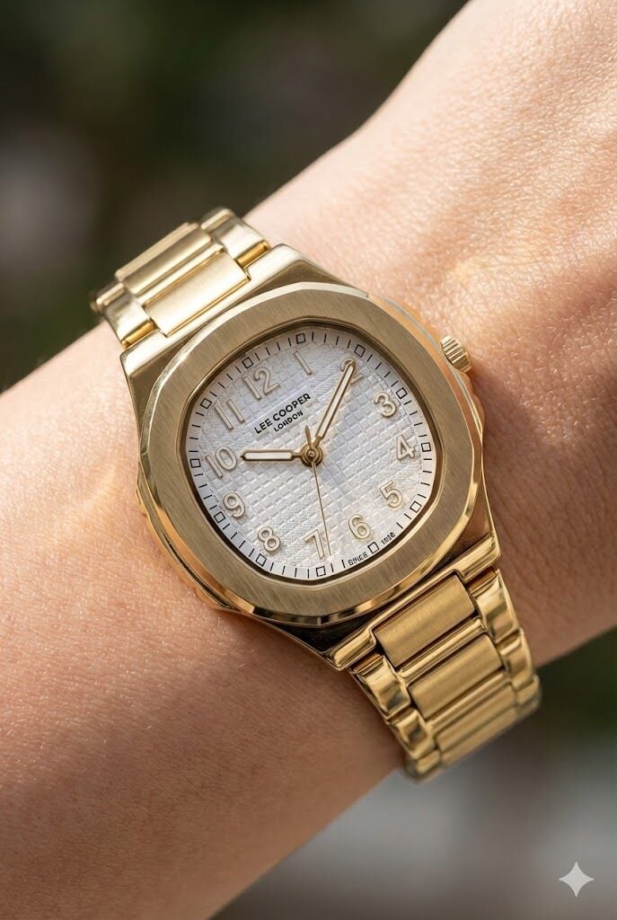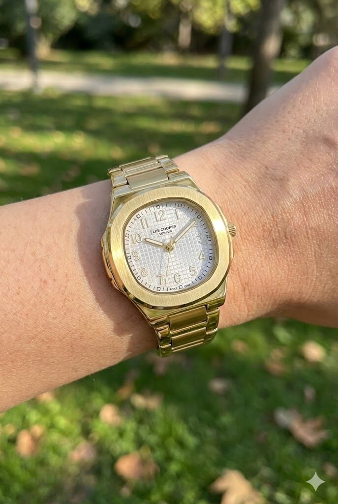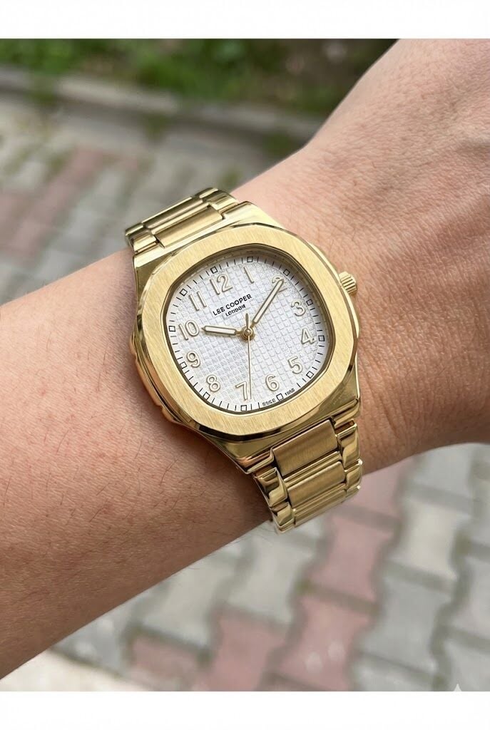 Lee Cooper kadın kol saati, altın renk çelik kasa ve çelik kordon tasarımıyla güçlü ve şık bir duruş sunar. Klasik yuvarlak kasa formu ve detaylı kadran yapısı sayesinde günlük kullanımdan özel anlara kadar her stile kolayca uyum sağlar.
