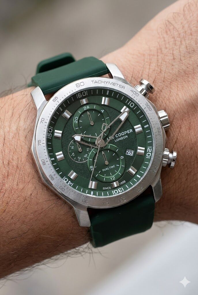 Lee Cooper erkek kol saati; yeşil kadranı, büyük kasa yapısı ve sportif tasarımıyla güçlü ve dikkat çekici bir stil sunar. Çok fonksiyonlu kadran yapısı, estetik görünümü fonksiyonellikle birleştirirken dinamik detaylarıyla öne çıkar. Aktif yaşam tarzını benimseyen ve maskülen duruşundan ödün vermek istemeyen erkekler için ideal bir tercihtir.