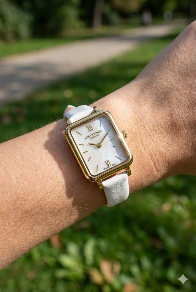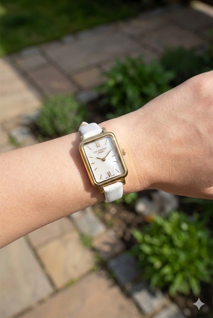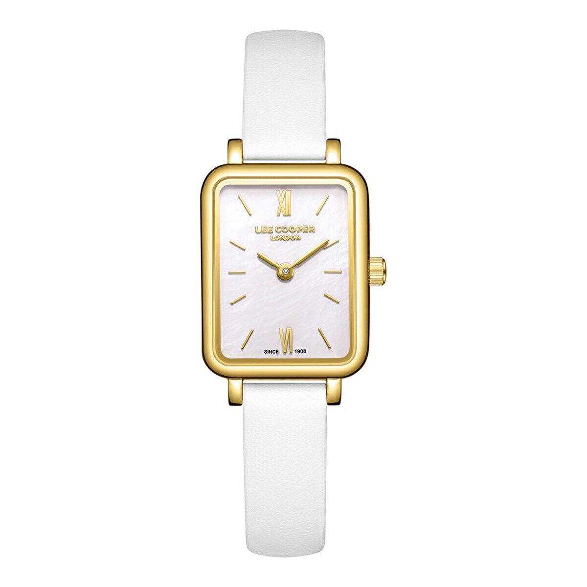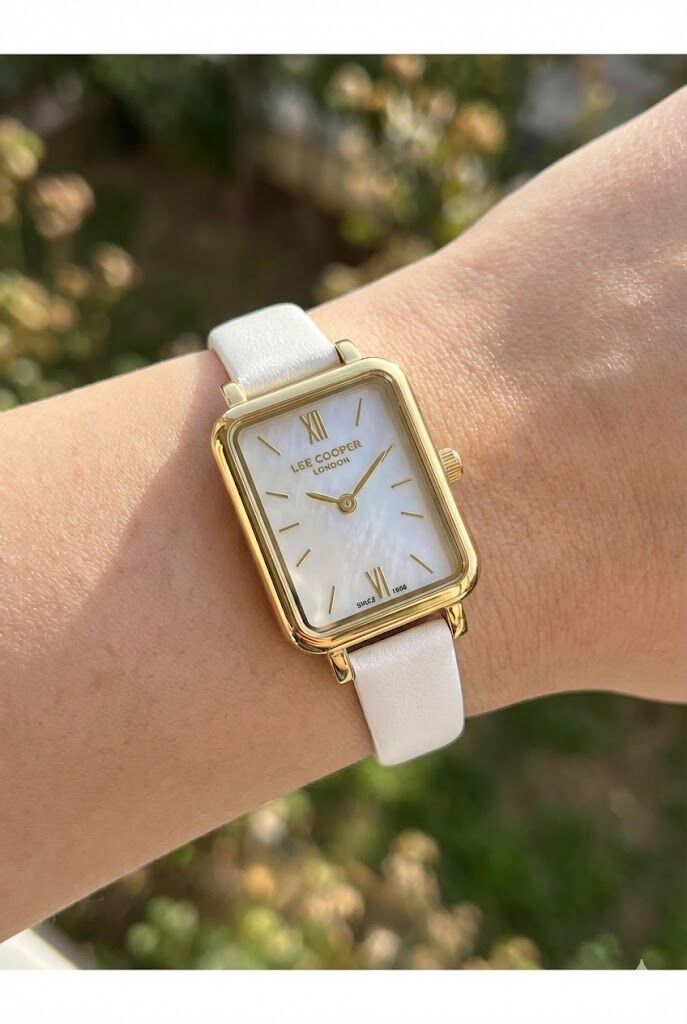 Lee Cooper kadın kol saati, ince dikdörtgen kasa formu ve sedef görünümlü kadran tasarımıyla zarif bir stil sunar. Altın renk kasa ve beyaz deri kordon uyumu, sade ve şık bir görünüm oluşturur.