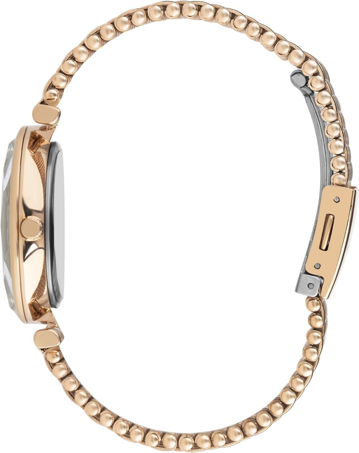 Rose gold renk ve taş detaylı kadranı sayesinde feminen ve şık bir görünüm sunar.