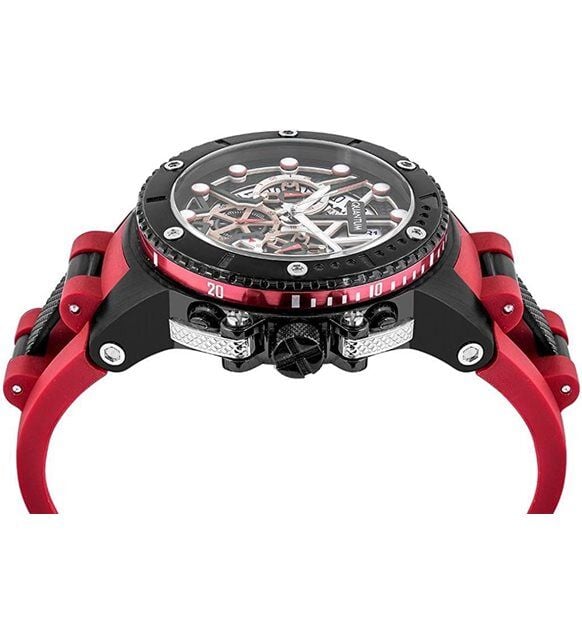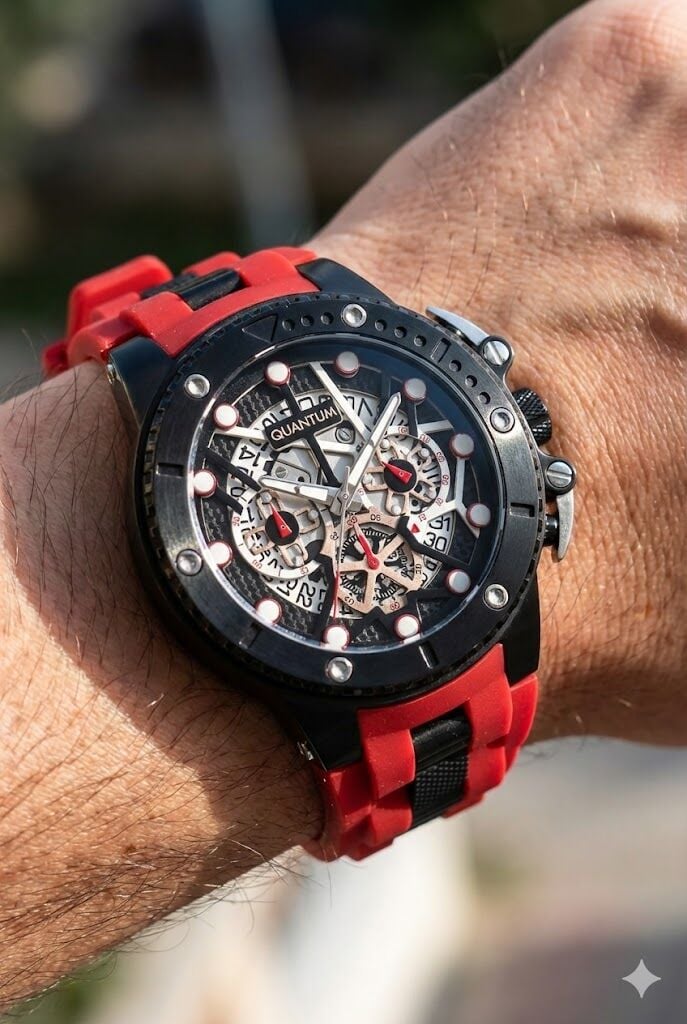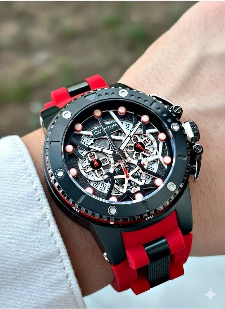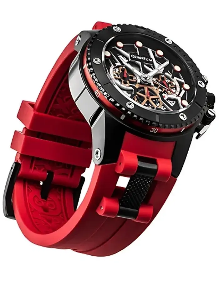 Quantum HNG535.658 erkek kol saati, 50 mm geniş kasa çapı ve güçlü spor tasarımıyla dikkat çeken özel bir modeldir. Siyah kasa yapısı ve kırmızı silikon kordon kombinasyonu ile dinamik ve iddialı bir görünüm sunar.