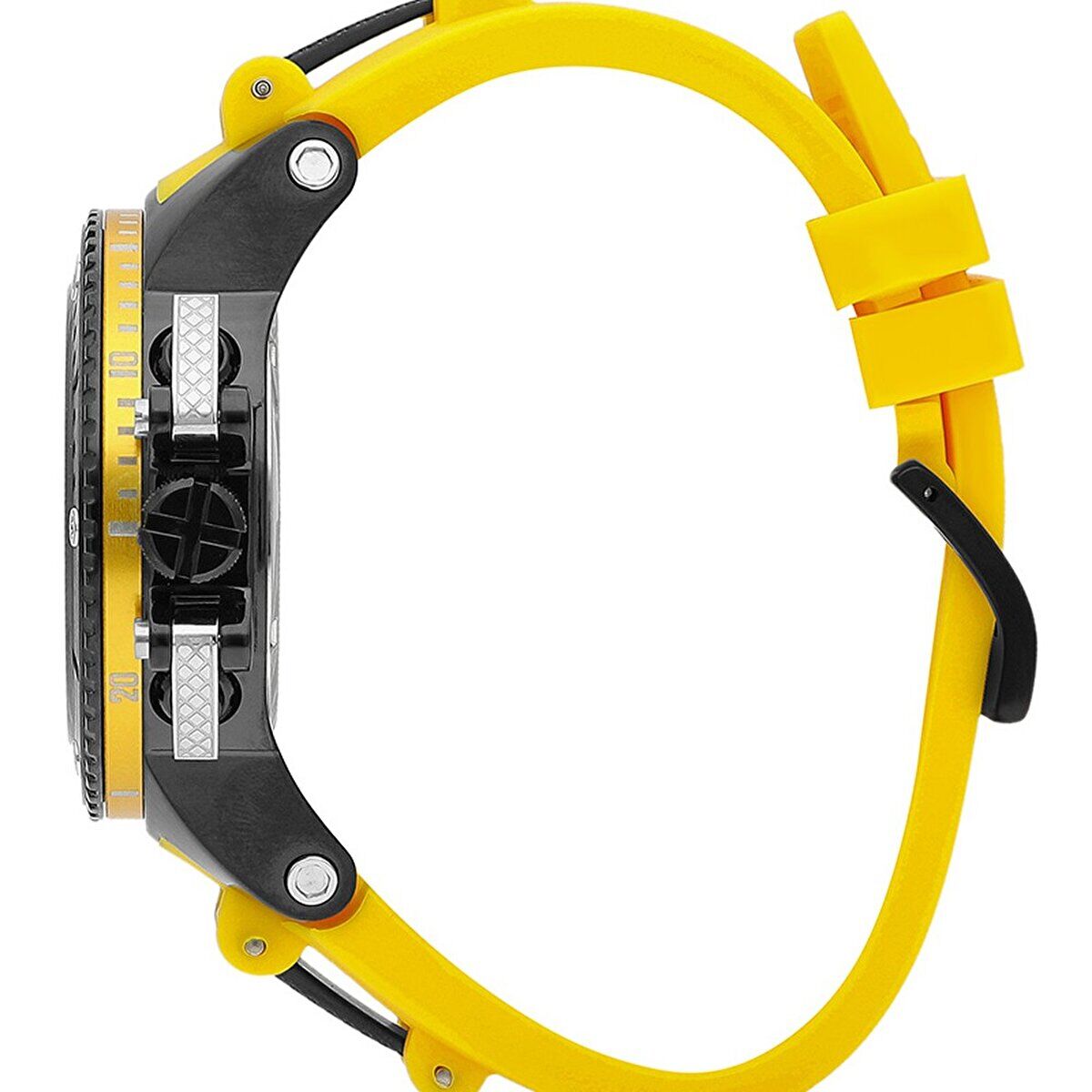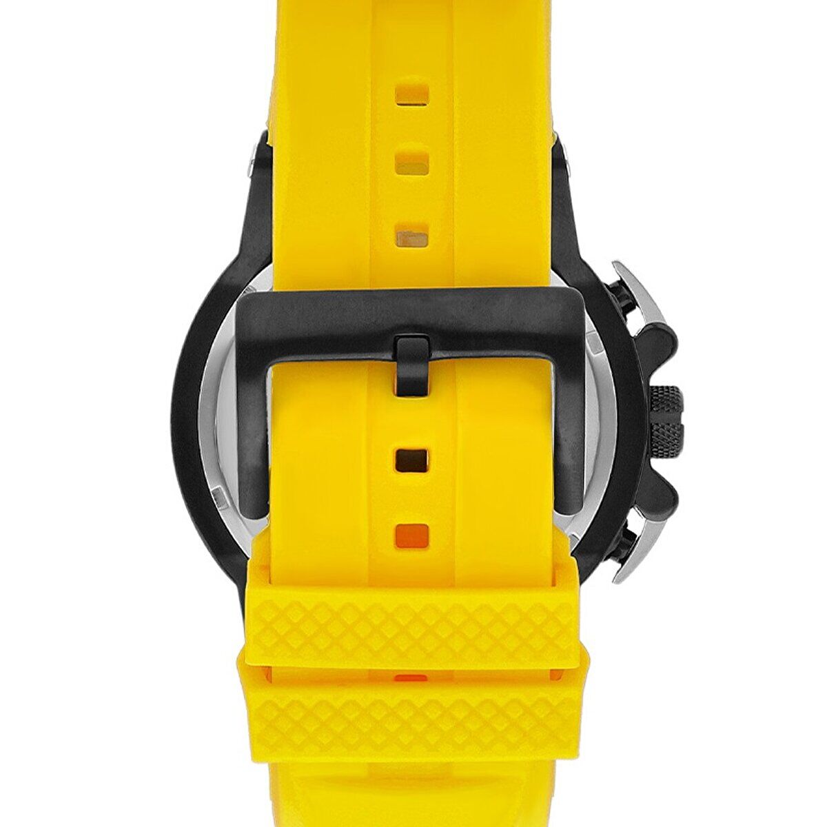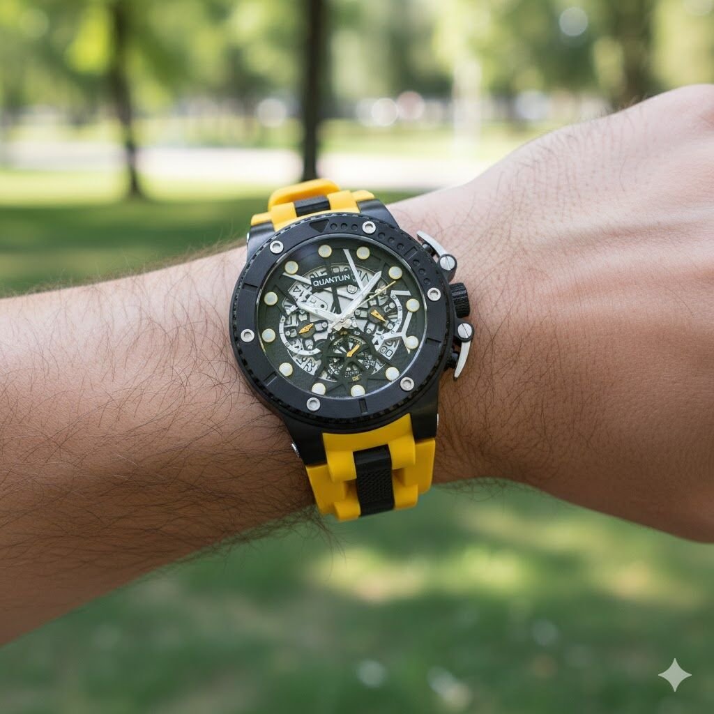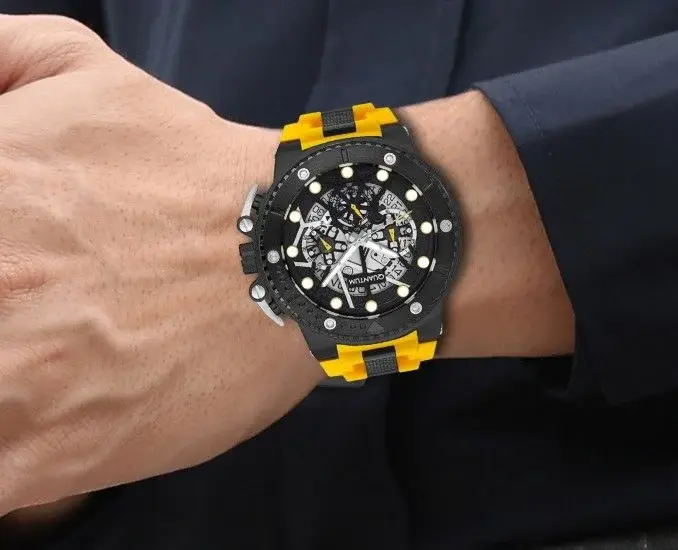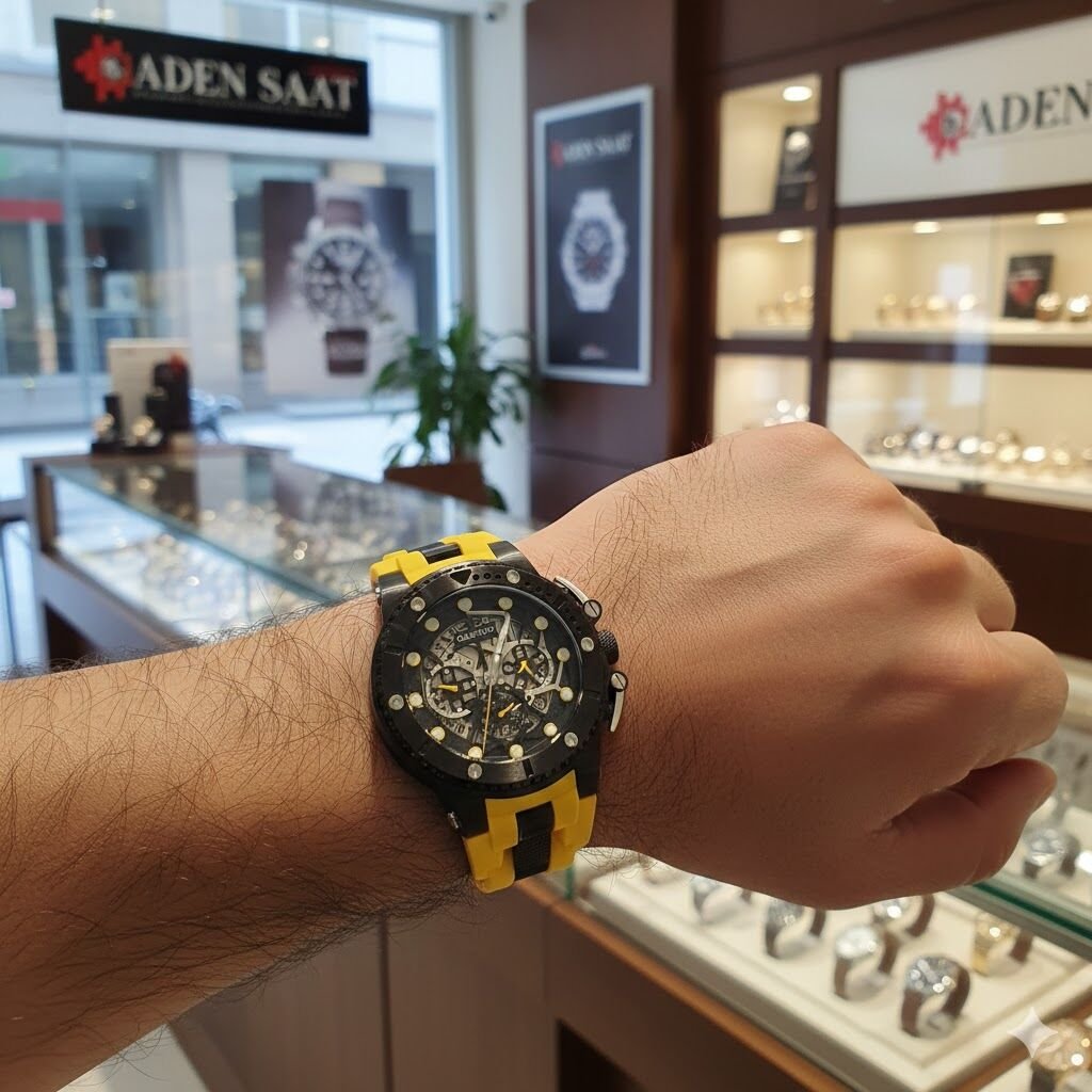Sarı silikon kordon ile siyah kasa arasındaki güçlü kontrast saate dinamik ve enerjik bir görünüm kazandırır. İskelet detaylı kadran, mekanik estetiği modern spor çizgilerle birleştirir.